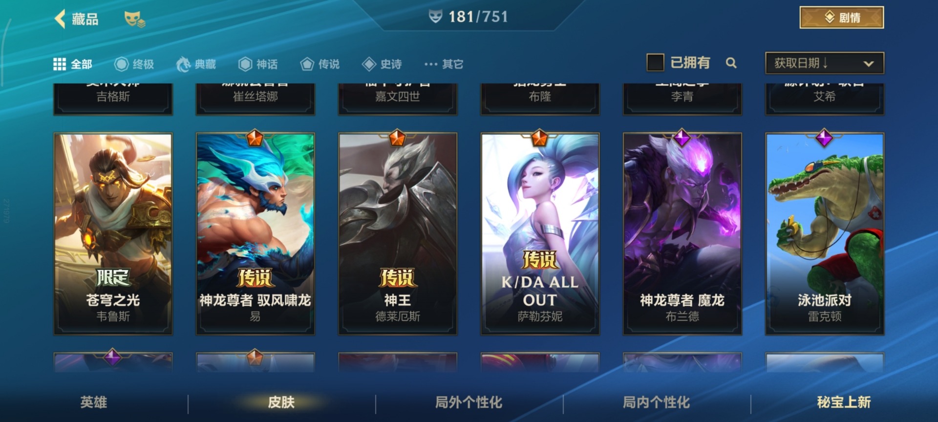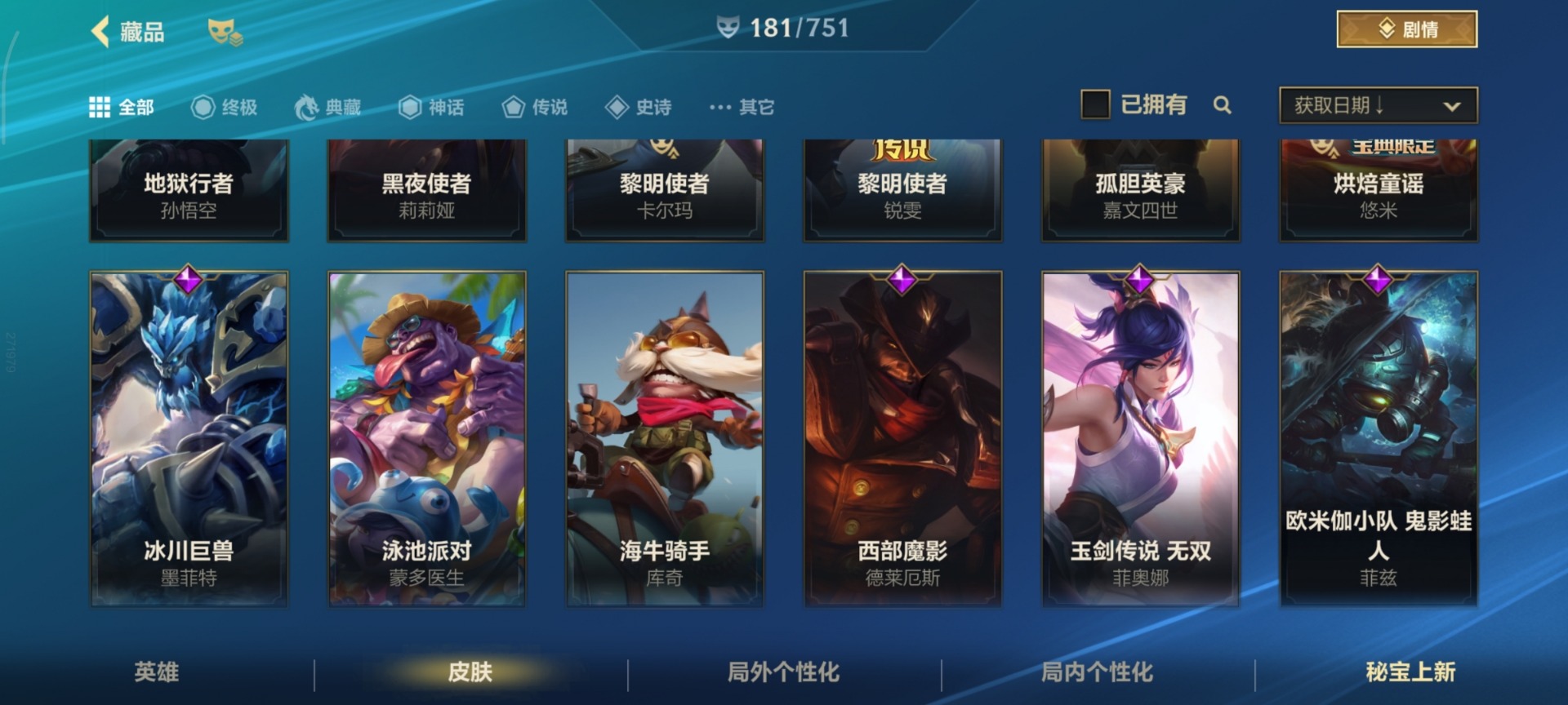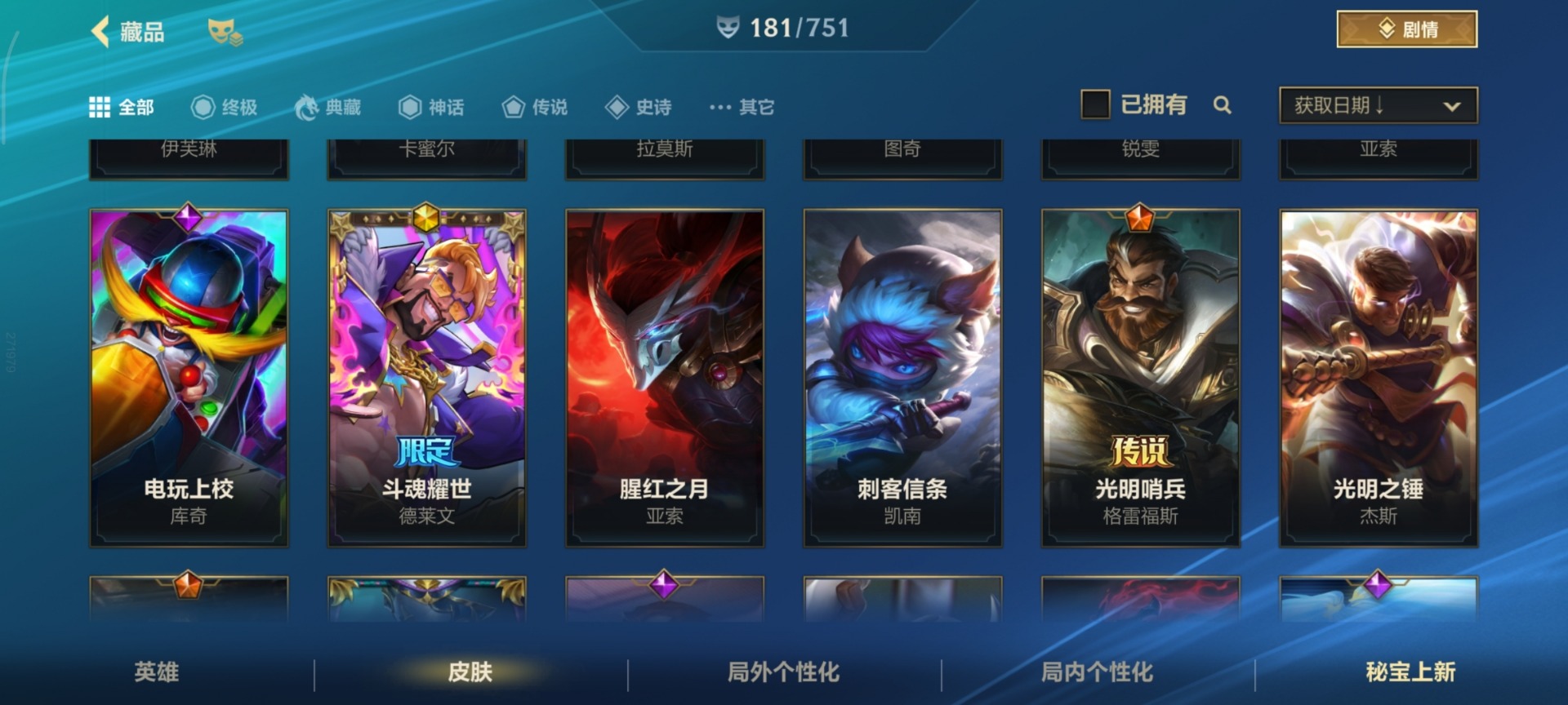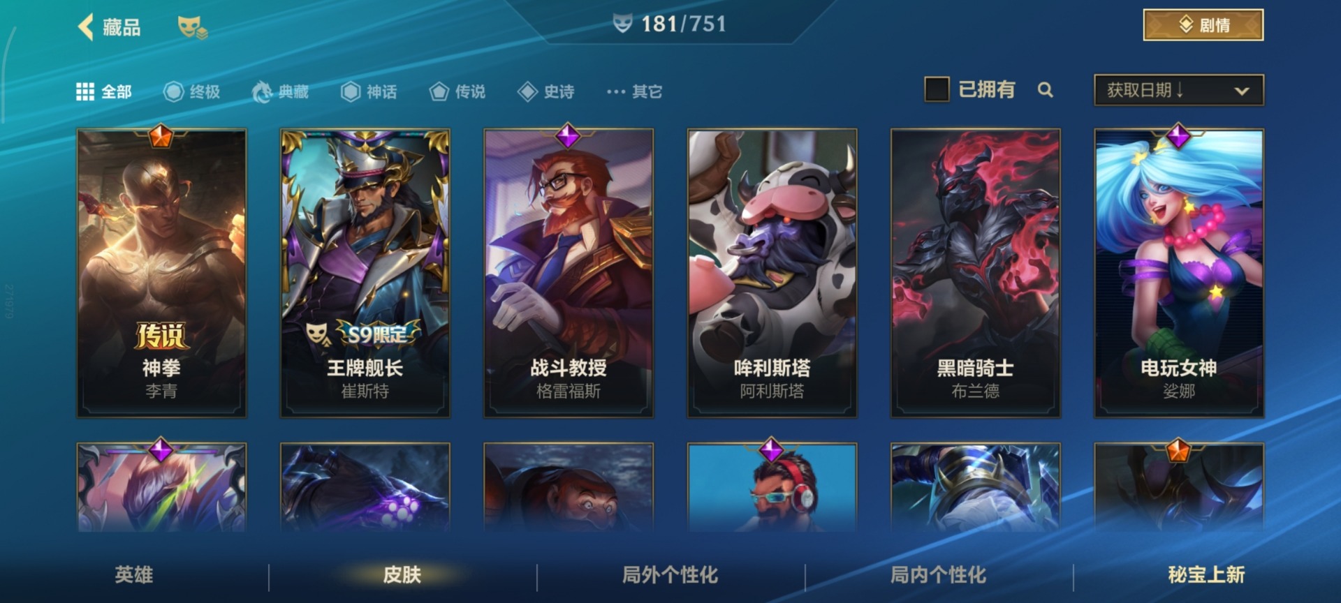 - PX_2009413-贵族等级: V7 英雄数: 121 皮肤数: 195 传说皮: 黄金白羊座,久胜战神,淬星耀世,末日机甲-孙策,乘龙·问璇玑 限定皮: 时雨天司,青春决赛季,孙行者,傲雪梅枪,五谷丰年