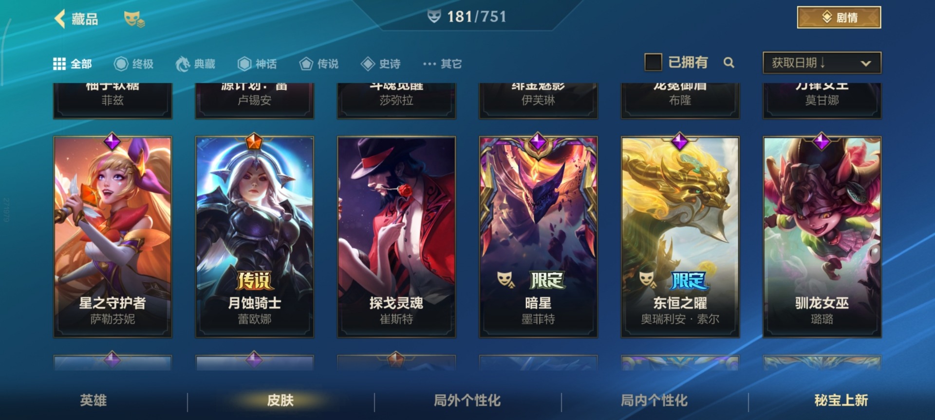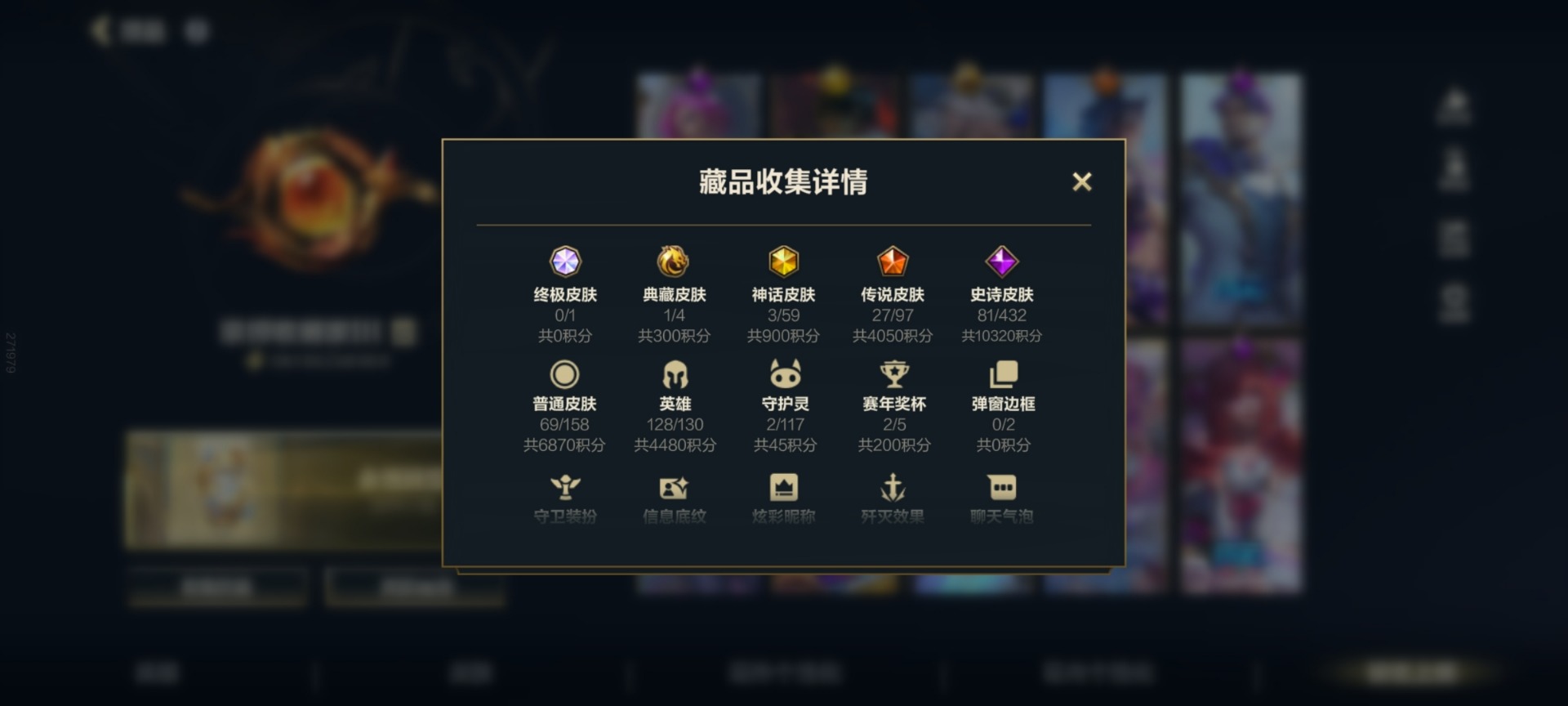 - PX_2106460-Q/至尊星耀/244皮肤/124英雄/1典藏/0珍品无双/0无双/2珍品传说/17传说/57史诗/8稀有英雄 【2 珍品传说】怪盗基德 马可波罗,江户川柯南 鲁班七号, 【1 典藏皮肤】最初的交响 伽罗, 【17 传说皮肤】启明星使 虞姬,无双飞将 马超,零号·赤焰 孙悟空,地狱火 孙悟空,云鹰飞将 曜,记忆之芯 公孙离,炽阳神光 镜,霜月吟 露娜,黄金狮子座 达摩,战鼓燎原