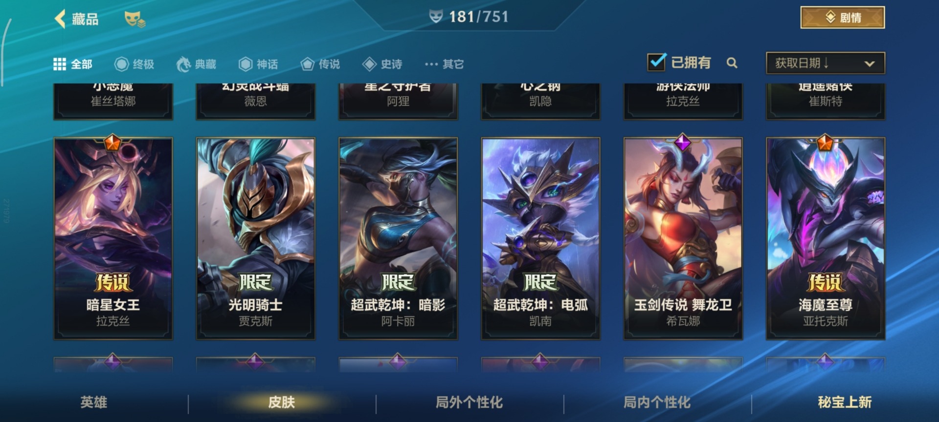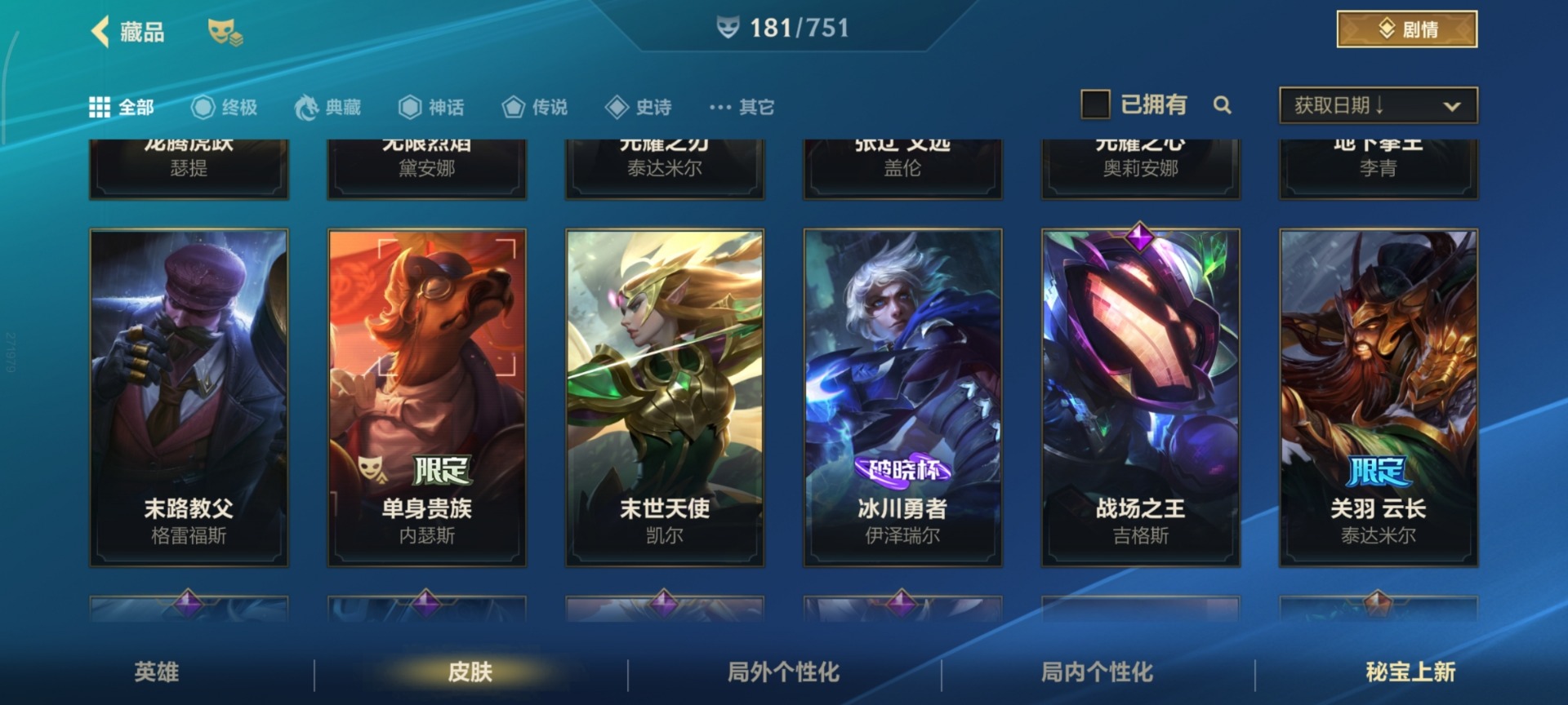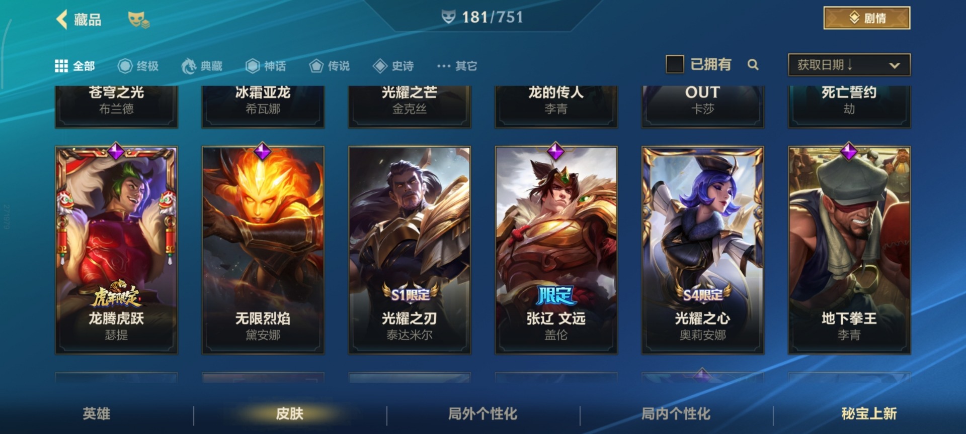 - [12204317]实名: 可修改 贵族等级: V6 英雄数: 123 皮肤数: 178 荣耀水晶: 最初的交响 传说皮: 冠军飞将,一念神魔,无双飞将,山海·炽霜斩,鹤归松栖(云缨) 限定皮: 李小龙,祈雪灵祝,蜜橘之夏,高山流水,猪悟能,五谷丰年,鸣野蒿,愿照·九州拓