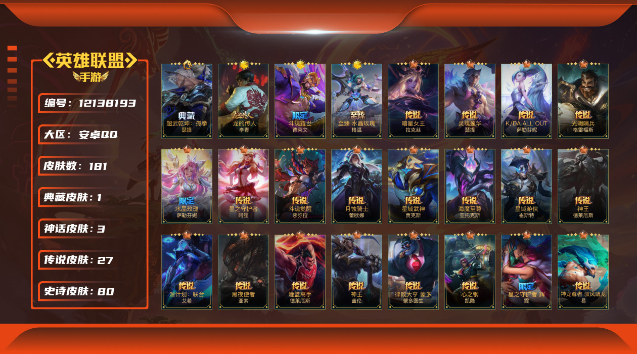 [12138193]27传说 80史诗 181皮肤 可二次 可修改实名 优质装备:灌篮高手,黑夜使者亚索,K/DA ALLOUT萨勒芬妮,黎明使者锐雯,炼狱魔犬,律政大亨,欧米伽小队 幽灵特工,神龙尊者 驭风啸龙,神拳盲僧,神王盖伦,神王诺手,天煞劫,星域游侠卡牌,星之守护者阿狸,星之守护者 辉,源计划:联合,月蚀骑士蕾欧娜,超武乾坤:孤拳,源计划:林,暗星女王拉克丝,光明哨兵格雷福斯,斗魂耀世德莱文,龙的传人,星域武神贾克斯,灵魂莲华腕豪,心之钢凯隐,水晶玫瑰萨勒芬妮,龙的传人,斗魂觉醒 莎弥拉 段位:翡翠 神话皮:至臻水晶格温 限定皮肤:赵云子龙,张辽文远,水晶玫瑰蔚,关羽云长 传说皮:海魔至尊 亚托克斯,黎明使者永恩
