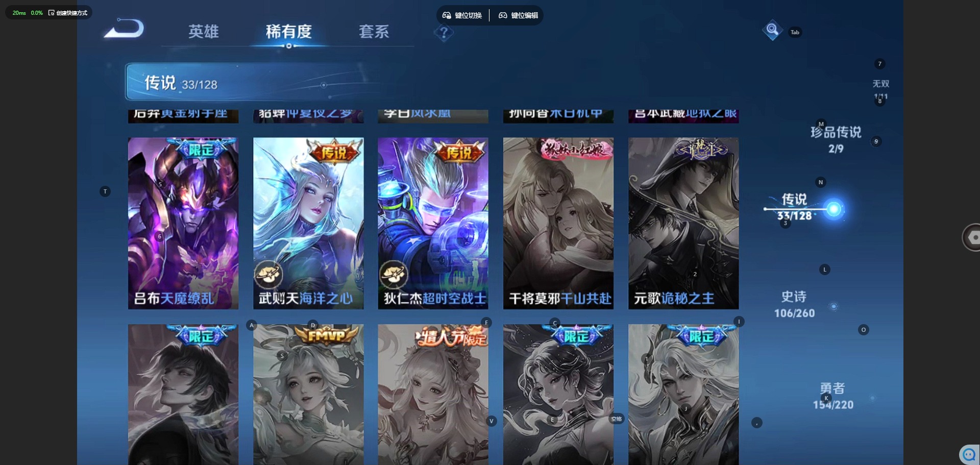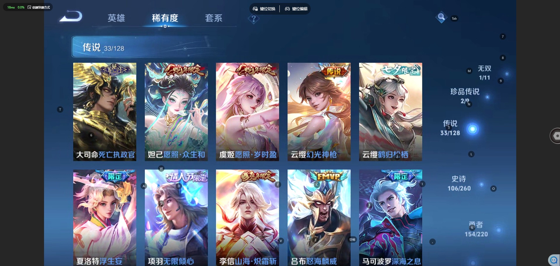 - [12207732]V7 2典藏 1无双 2珍品传说 12传说 104英雄 114皮肤 可修改实名 优质装备:鸣剑·曳影,弑枪猎影(韩信典藏),天机白泽,怪盗基德,大耳狗之梦,云鹰飞将(小将军),绛天战甲(鸡嘴战神),猫影幻舞,炽阳神光,末日机甲-孙尚香(绿蚂蚱),涂山容容 传说皮:云诺千山,幻光神枪 限定皮:愿照·九州拓(澜年限),逐霄战戟,鸣野蒿,至尊宝,寅虎·展翼(孙膑年限),诗剑行,辉光之辰,蜜橘之夏,寅虎·瑞焰(虎皮蛋子),寅虎·赤拳(老虎年限) 史诗皮:赞萌露比,鸭鸭历险记-刘禅,谪仙醉月,龙之律动,百相守梦-周瑜,破空之剑,百相守梦-百里守约,百相守梦-黄忠,织梦人,紫霞仙子,电玩小子(小书包),黄金分割率,千年之狐,魅语,时之恋人-孙尚香,节奏热浪,水果甜心,天才门将,德古拉伯爵,暗隐猎兽者,鬼剑武藏,舞动绿茵,逐浪之夏,水晶猎龙者,箭羽风息,原初追逐者,圣诞狂欢,鹰眼统帅,赏金猎手