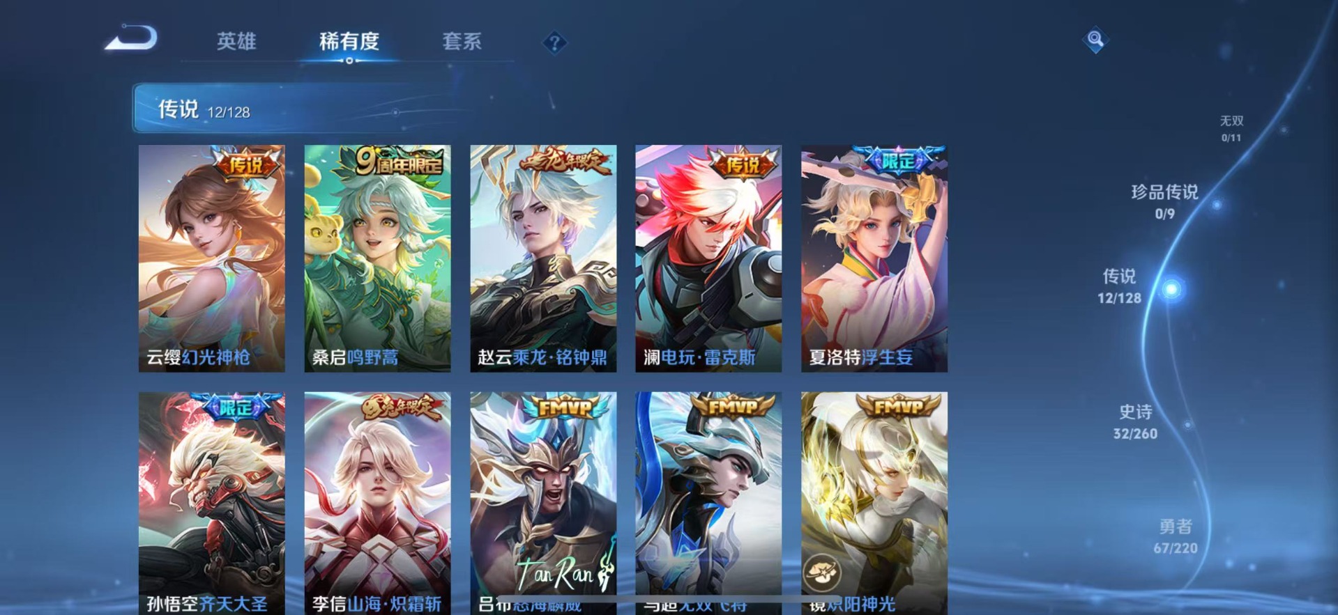 - [11966575]V6 3传说 122英雄 245皮肤 可修改实名 优质装备:地狱火 传说皮:乘龙·铭钟鼎(赵云年限) 珍宝阁皮:妄想食味,蔷薇恋人,玩趣恶龙 限定皮:鸣野蒿,至尊宝,傲雪梅枪,高山流水,五谷丰年,青龙志(铠年限),御风骁将(吕布年限),李小龙,猪悟能 史诗皮:星界战将,琥珀纪元伽罗,蔬乡物语(鲁班七号),紫霞仙子,黄金分割率,特工魅影,千年之狐,雪夜绮愿(周瑜),百解令(蒙犽),高渐离燃音魔法,冰冠公主,末日机甲-吕布,猫狗日记-孙策,猫狗日记-大乔,乱世虎臣,节奏热浪,修罗,女仆咖啡,摇滚巨星,水果甜心,星夜王子,心灵骇客,功夫厨神,暗隐猎兽者,幽灵船长,鬼剑武藏,心灵战警,舞动绿茵,地狱岩魂,纤云弄巧,繁星吟游(呼啦呼啦),拒霜思,缤纷独角兽,乘风破浪,逐浪之夏,月团寄思,水晶猎龙者,曙光守护者,箭羽风息,金属风暴,圣诞恋歌,鹰眼统帅,王者之锤,暗夜贵公子,无心,未来纪元-赵云
