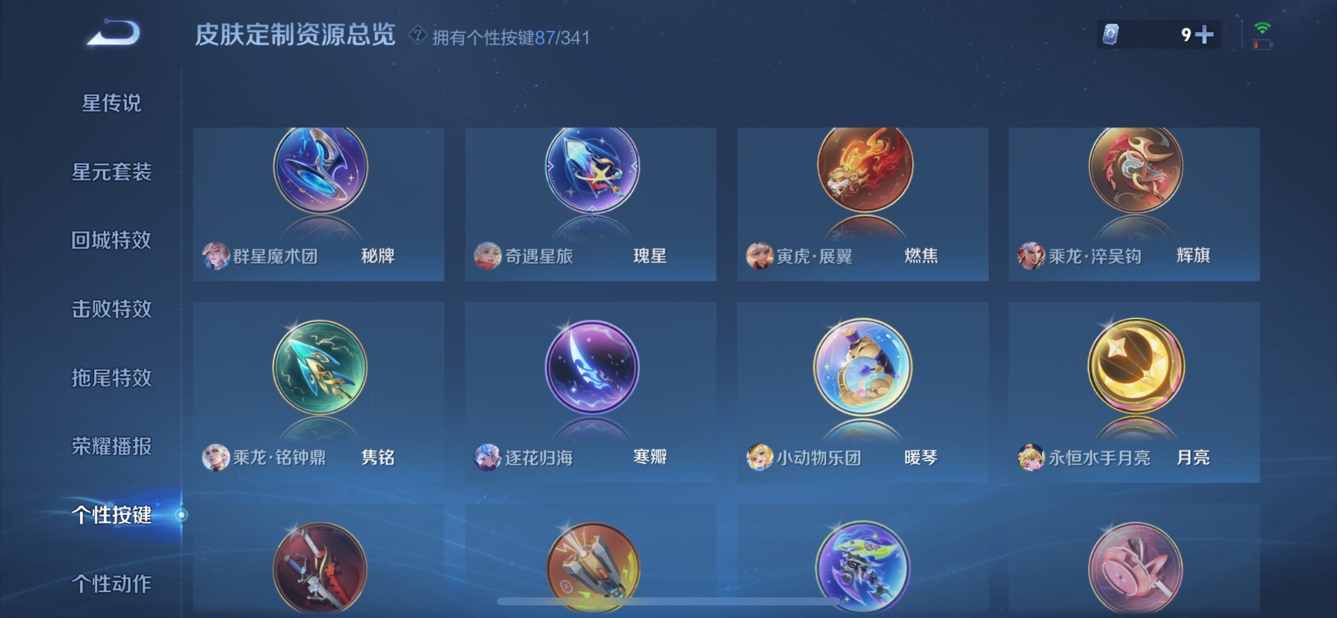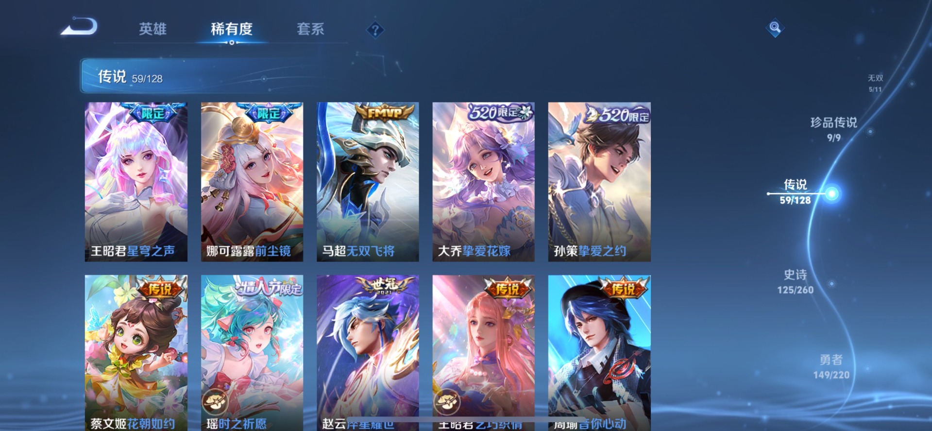 夏侯惇霜北刀,盾山梦圆繁星,伽罗天狼溯光者,赵云百木心枪,赵云龙胆,孙膑天狼运算者,孙膑寅虎·展翼,庄周玄嵩,诸葛亮时雨天司,杨玉环寅虎·心曲,司空震愿照·山河定,上官婉儿梁祝,上官婉儿神器·万象笔,李白诗剑行,花木兰默契交锋,安琪拉魔法小厨娘,马可波罗山海·玄木吟,艾琳陌上桑,西施至美·乘鲤谣,桑启鸣野蒿,女娲愿照·千秋盛,孙悟空至尊宝,妲己愿照·众生和,韩信傲雪梅枪,蔡文姬愿照·福禄聚,瑶时之祈愿,瑶山海·碧波行,澜愿照·九州拓,虞姬愿照·岁时盈,娜可露露前尘镜,王昭君星穹之声,王昭君映山客