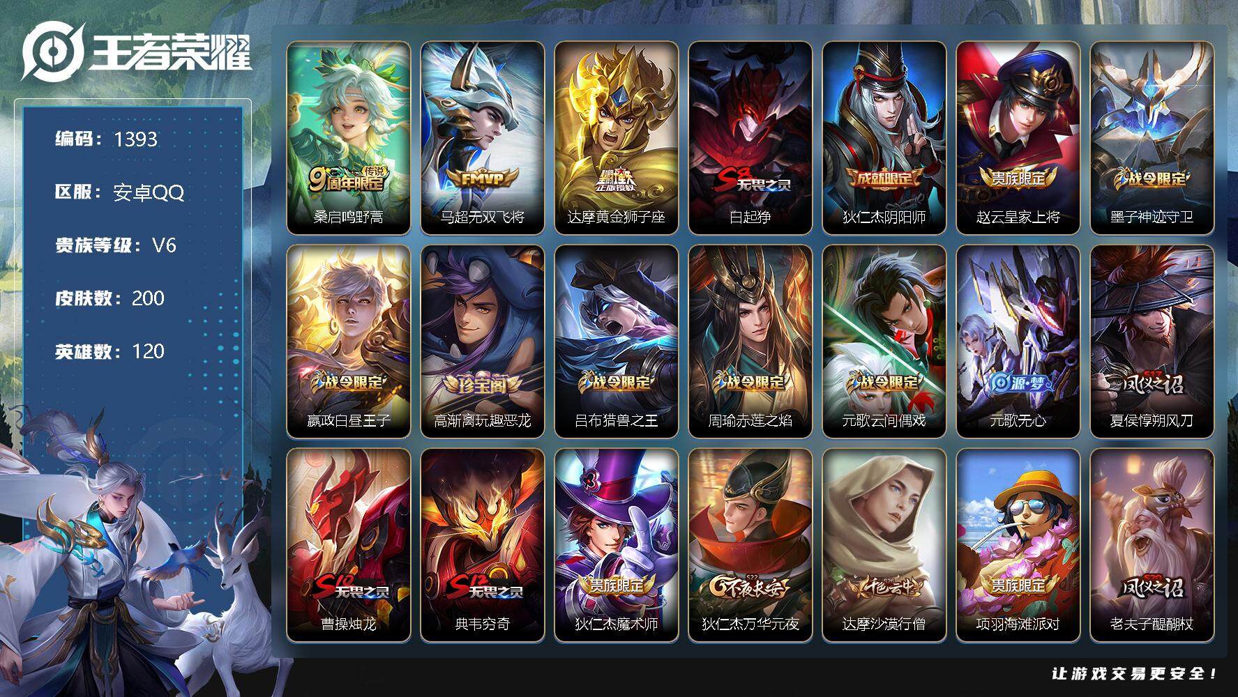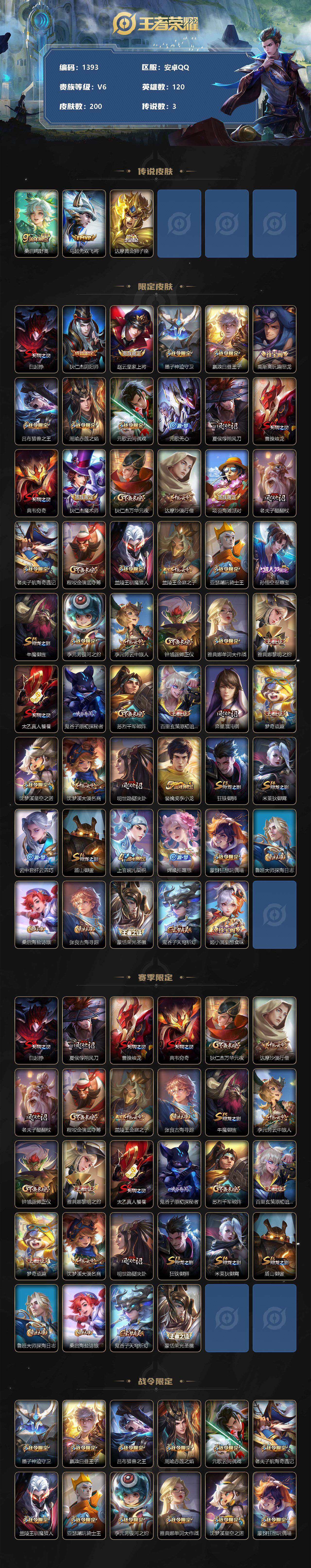 [12139462]【商品标题】:安卓Q-V0-最强王者段位-120英雄-200皮肤-0典藏-0珍品无双-0无双-0珍品传说-3传说-46史诗