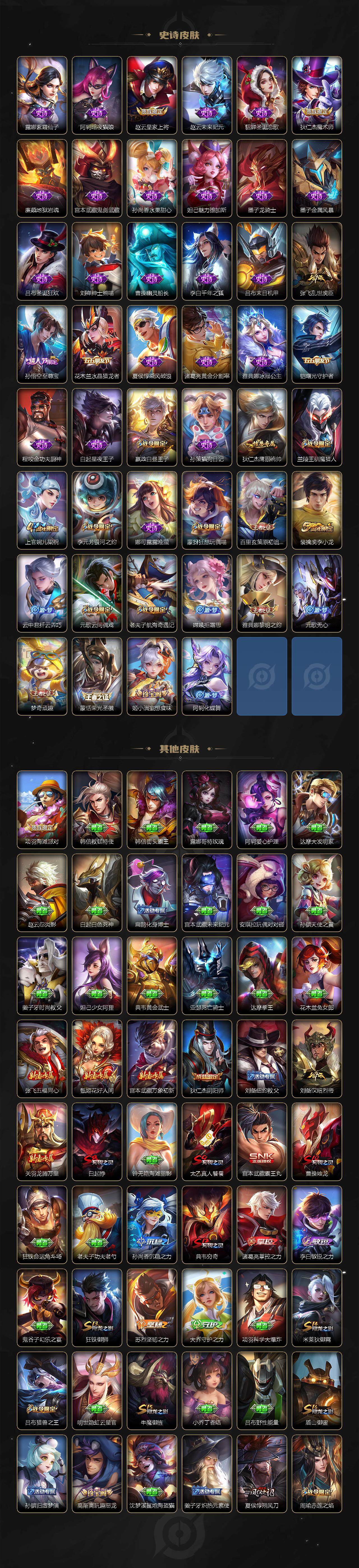【史诗皮肤】:露娜紫霞仙子,阿轲暗夜猫娘,赵云皇家上将,赵云未来纪元,貂蝉圣诞恋歌,狄仁杰魔术师,廉颇地狱岩魂,宫本武藏鬼剑武藏,孙尚香水果甜心,妲己魅力维加斯,墨子龙骑士,墨子金属风暴,吕布圣诞狂欢,刘禅绅士熊喵,曹操幽灵船长,李白千年之狐,吕布末日机甲,张飞乱世虎臣,孙悟空至尊宝,花木兰水晶猎龙者,夏侯惇乘风破浪,诸葛亮黄金分割率,雅典娜冰冠公主,铠曙光守护者,程咬金功夫厨神,白起星夜王子,嬴政白昼王子,孙策猫狗日记,狄仁杰鹰眼
