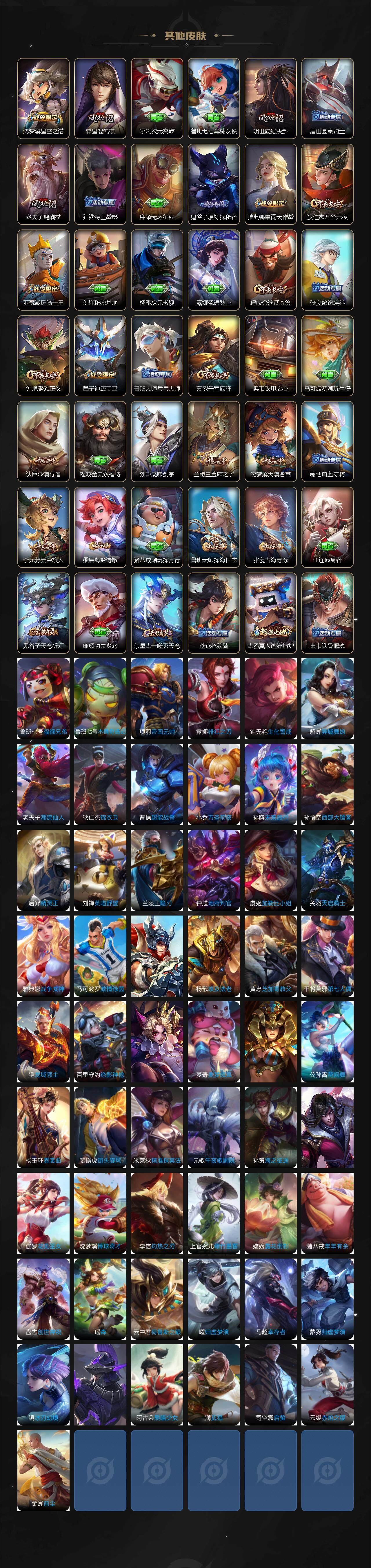 【限定皮肤】:白起狰,狄仁杰阴阳师,赵云皇家上将,墨子神迹守卫,嬴政白昼王子,高渐离玩趣恶龙,吕布猎兽之王,周瑜赤莲之焰,元歌云间偶戏,元歌无心,夏侯惇朔风刀,曹操烛龙,典韦穷奇,狄仁杰魔术师,狄仁杰万华元夜,达摩沙漠行僧,项羽海滩派对,老夫子醍醐杖,老夫子航海奇遇记,程咬金演武夺筹,兰陵王驯魔猎人,兰陵王金庭之子,亚瑟潮玩骑士王,孙悟空至尊宝,牛魔御旌,李元芳银河之约,李元芳云中旅人,钟馗驱傩正仪,雅典娜单词大作战,雅典娜黎明之约,太乙真人饕餮,鬼谷子原初探秘者,苏烈千军破阵,百里玄策原初追逐者,弈星混沌棋,梦奇顽趣,沈梦溪星空之诺,沈梦溪大漠名商,明世隐疑决卦,裴擒虎李小龙,狂铁御狮,米莱狄御霄,云中君纤云弄巧,盾山御銮,上官婉儿梁祝,嫦娥拒霜思,蒙犽狂想玩偶喵,鲁班大师探海日志,桑启海盐诗旅,张良古海寻踪,蒙恬荣光圣徽,鬼谷子天穹祈灯,姬小满妄想食味