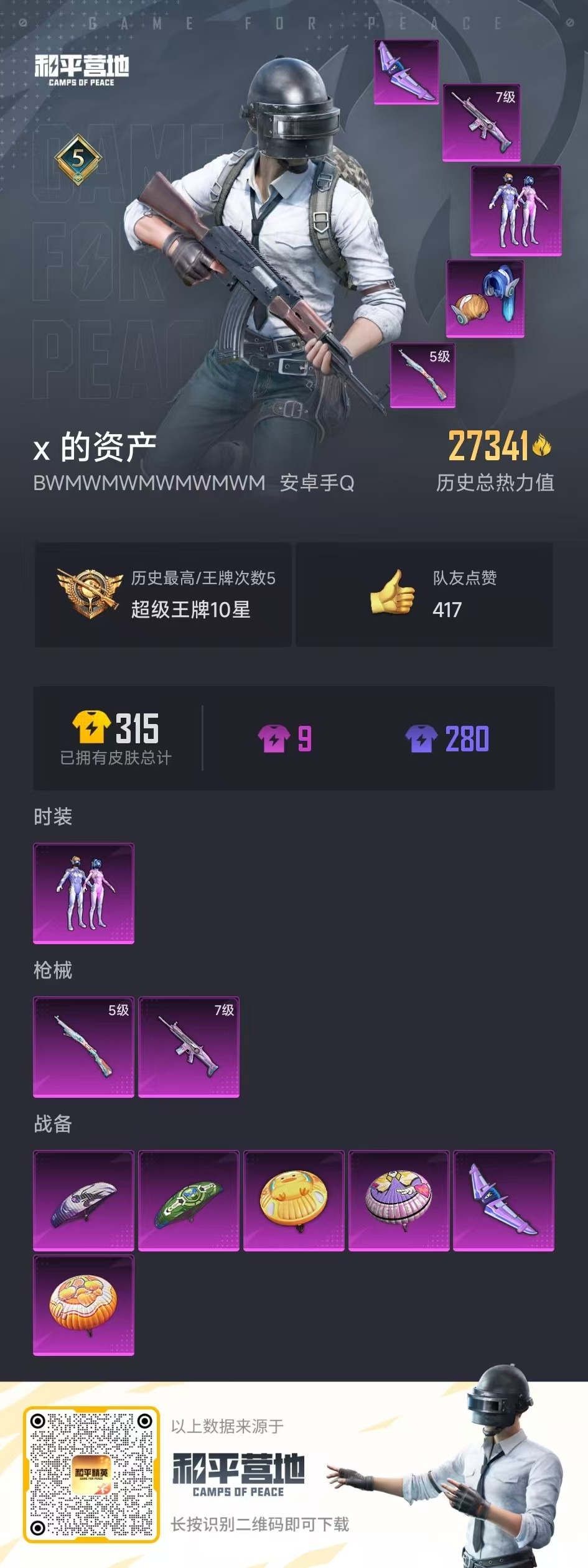 - PX_2080415-苹果QQ 历史总热力值:167931 粉装数量:34 特效枪数量:27 载具数量:14 王牌印记:5 历史最高段位:超级王牌13星 套装数量:247 时装数量:932 枪械数量:335 战备数量:203 装备数量:475 载具:合金龙骨(红),兰博基尼URUS(尊享铂),路特斯ELETRE(冰川蓝),阿斯顿·马丁DBX(橙),兰博基尼Estoque(银翼灰),特斯拉Roads