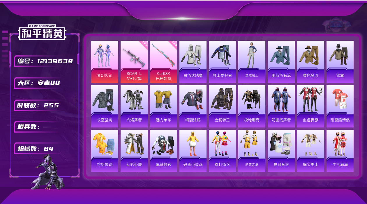 [12139639]1粉装 2特效枪 5印记 可二次 可修改实名 优质装备:SCAR-L梦幻火箭,梦幻火箭(新101)(新火箭少女101粉色套装),七级SCAR-L-梦幻火箭,Kar98K-巳巳如意 五级特效枪:五级Kar98K-巳巳如意 紫色装扮:SS22特训,SS23特训,娇憨猪猪,萌趣咩咩,SS21特训,SS31特训套装,冷焰舞者,SS33特训套装,SS20特训,飞驰魅影,音速流光,SS19特训,甜心亚梦,虚音幻奏,SS18特训,长空猛禽,霓虹街区,缤纷果语,血色贵族,飞行日记,魅力单车,麻辣教官,黄色名流,龟仙人,蝶变,极地朋克,柠萌假日,夏日音浪,幻世战舞者,探宝勇士,湖蓝色名流,绮丽涂鸦,登山爱好者,白色伏地魔,破蛋小黄鸡,空岛之星,甜蜜熊情侣,王牌教练,牛气冲天,炫蓝之夏,牛气满满,猛禽,雏菊兔兔,萝兰蝴蝶,SS29特训,星途旅人,SS28特训,光矢逐梦,玉兔迎春,巳巳如意,青团波波,糖糖葫芦,竞技名士,无暇誓言,金羽特工,智谋强哥,SS32特训服(SS32特训套装),萌黄之夏,白糯汤圆,幻影公爵,光之冒险 优质战备:忍者神龟降落伞,橘柚倾心降落伞,垂柳戏鸭降落伞,幻影战神降落伞,梦幻火箭降落伞,梦幻火箭飞行器