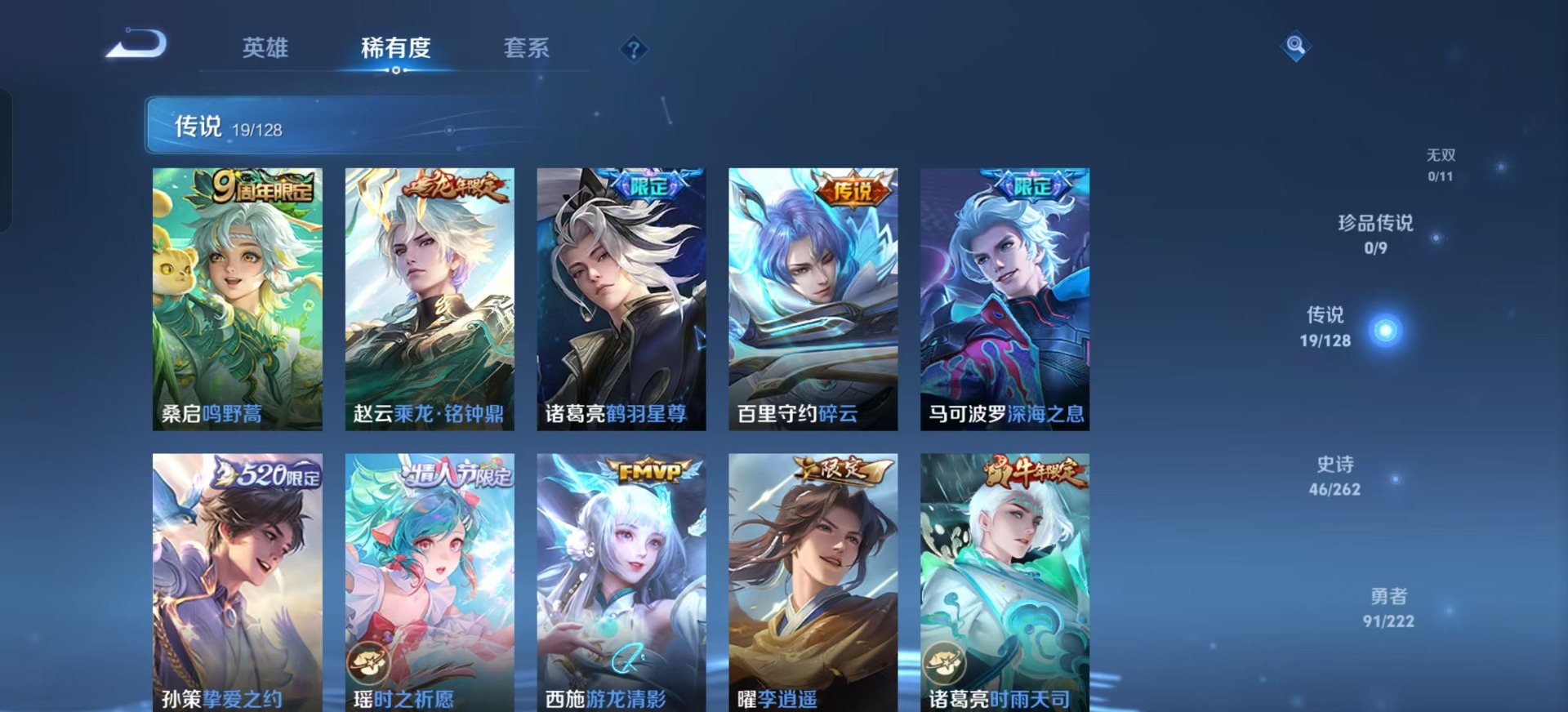 夏侯惇朔风刀,老夫子醍醐杖,沈梦溪大漠名商,盾山御銮,苏烈千军破阵,达摩沙漠行僧,牛魔御旌,项羽苍威无极,镜青焰无极,兰陵王金庭之子,鲁班大师探海日志,明世隐疑决卦,鬼谷子原初探秘者,张良古海寻踪,桑启海盐诗旅,狄仁杰万华元夜,程咬金演武夺筹,弈星混沌棋,米莱狄御霄,钟馗驱傩正仪,狂铁御狮
