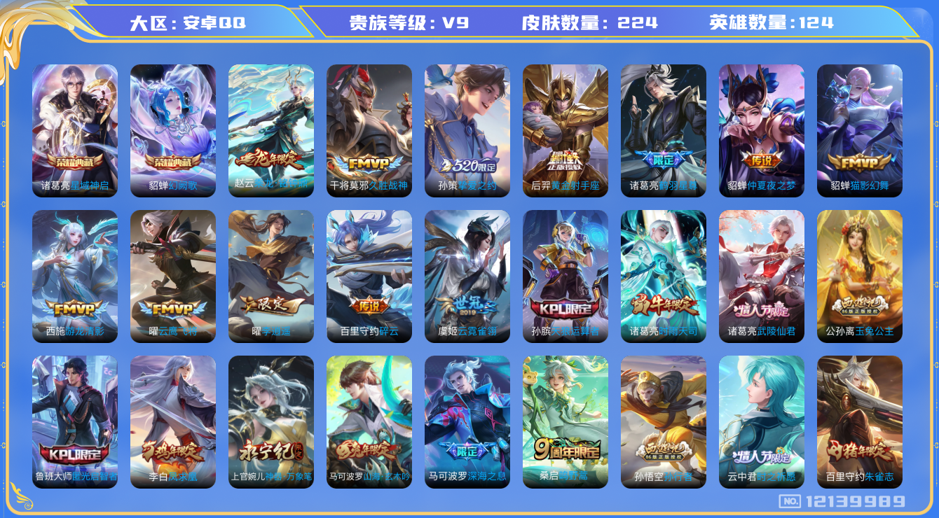 [12139989]V9 2典藏 19传说 124英雄 224皮肤 可修改实名 优质装备:星域神启(倪克斯贼亮),幻阙歌(貂蝉典藏),黄金射手座,云鹰飞将(小将军),猫影幻舞,久胜战神,云霓雀翎,仲夏夜之梦(大飞蛾),李逍遥,游龙清影(小青龙),挚爱之约,碎云,鹤羽星尊 传说皮:乘龙·铭钟鼎(赵云年限) 珍宝阁皮:蔷薇恋人 限定皮:鸣野蒿,凤求凰(白切鸡),武陵仙君(小桃花),时雨天司(水龙头),山海·碧波行(瑶年限),天狼运算者,朱雀志(守约年限),孙行者,时之祈愿-云中君,时之祈愿-瑶(瑶传限),玉兔公主,深海之息(深海大菠萝),匿光启智者,神器·万象笔,山海·玄木吟(马可年限) 史诗皮:鸭鸭历险记-刘禅,谪仙醉月,石田雨龙,百相守梦-周瑜,茶境仙,海诺心动手记,遇见神鹿,紫霞仙子,黄金分割率,特工魅影,真我赫兹(百里守约),冰冠公主,青蛇,偶像歌手,末日机甲-吕布,时之恋人-孙尚香,乱世虎臣,水果甜心,绅士熊喵,心灵骇客,幽灵船长,鬼剑武藏,心灵战警,纤云弄巧,繁星吟游(呼啦呼啦),逐浪之夏,金属风暴,鹰眼统帅,魅力维加斯,未来纪元-赵云