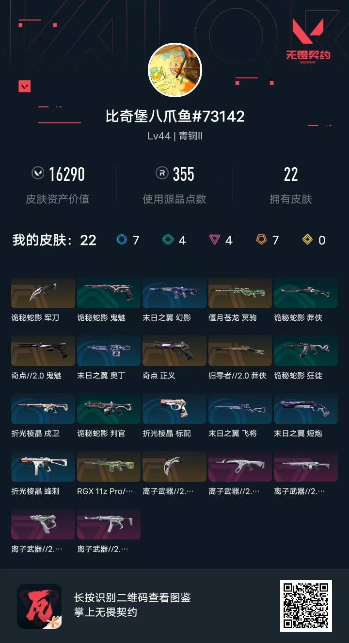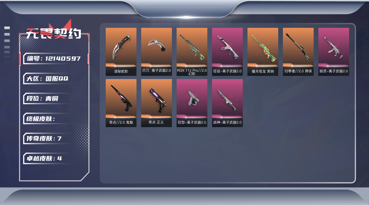 [12140597]7橙皮 4紫皮 22皮肤 355已用源晶 青铜 优质装备:正义-奇点,冥驹-偃月苍龙,鬼魅-奇点//2.0,离子武器2.0 爪刀,诡秘蛇影 佩枪皮肤:狂怒-离子武器2.0 冲锋枪皮肤:骇灵-离子武器2.0 步枪皮肤:幻影-RGX 11z Pro//2.0,狂徒-离子武器2.0 狙击枪皮肤:莽侠-归零者//2.0 机枪皮肤:战神-离子武器2.0