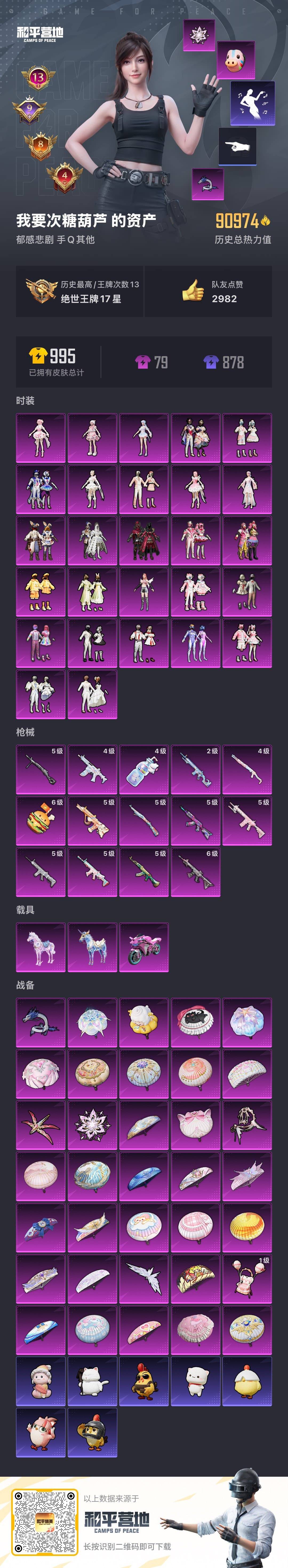 - PX_2105862- 苹果手Q-13王牌印记-8粉装-5特效枪-2载具-73653热力值-172套装-228枪皮-1卓越印记-0传奇印记 【8粉装】,梦幻火箭,宝贝奶油派,极致幻想,星之信仰,射星猎手,橘柚倾心,香水柠檬,星之彼岸 【5特效枪】SCAR-L-纯梦嫁纱-5级 M416-心之恋语-7级 GROZA-香水柠檬-7级 M762-甜蜜誓约-5级 Kar98K-伏魔团-5级 【6稀有紫装】