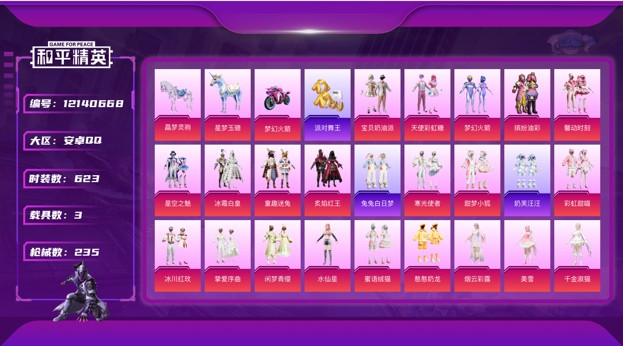 [12140668]27粉装 14特效枪 3载具 13印记 可二次 可修改实名 身法装备:舞王派对(派对舞王、小金鞋),萌熊伴侣背包(粉熊背包) 优质装备:星梦玉骢,晶梦灵驹,舞王派对(派对舞王、小金鞋),萌熊伴侣背包(粉熊背包),AKM炫紫旋律,梦幻火箭(新101)(新火箭少女101粉色套装),宝贝奶油派,天使彩虹糖,缤纷油彩(猪妹猪脸妹),炙焰红王,冰霜白皇,童趣迷兔,星空之魅,馨动时刻,SCAR-L纯梦嫁纱,M417第五大道,M416超新星,AKM绿萝繁花,SCAR-L-锦绣绵绵,SPAS-12蜜语绒猫,千金淑猫,AUG-暖羊咩咩,破片手榴弹-热量炸弹,MK12-雪月幻音,星穹咏叹调,烟雾弹-甜梦果泡,荧海星豚,蜜獾-荧海星豚,奇迹舞步-美雪,羊梦糖心,Kar98K-巳巳如意 热门装扮:甜梦小狐,寒光使者,彩虹甜喵,冰川红玫,冰川幽秘,挚爱序曲,第五大道,水仙星,闲梦青缨,憨憨奶龙,蜜语绒猫,烟云彩露,美雪,兔兔白日梦,奶芙汪汪,派对舞王(小金鞋) 载具:双人摩托-梦幻火箭 稀有枪皮:DP-28-豹影疾电 六级特效枪:六级破片手榴弹-热量炸弹,六级M416-超新星 五级特效枪:五级Kar98K-伏魔团,五级Kar98K-巳巳如意,五级DP-28-豹影疾电,五级AUG-暖羊咩咩,五级M417-第五大道,五级SCAR-L-纯梦嫁纱,五级SCAR-L-锦绣绵绵,五级AKM-绿萝繁花 四级特效枪:四级蜜獾-荧海星豚,四级烟雾弹-甜梦果泡,四级SPAS-12-蜜语绒猫 二级特效枪:二级MK12-雪月幻音 紫色装扮:幻彩翩翩,SS23特训,妙红点点,霓虹热舞,SS30特训套装,SS31特训套装,云朵鹅,彩虹兔,雪绒豹,SS33特训套装,青涩时光,旭日情侣,田园牧歌,轻风白浪,和煦暖阳,SS22特训,莱茵河畔,香榭午后,龙舌兰冰茶,顶瓜瓜,双彩绵绵,完美偶像,帅气教官,浓情摩卡,俏皮奶喵,暖心橘喵,魔力冰咖,雪兔飞飞,黄色名流,飞行日记,魅力单车,黄色运动,黎明保卫者,龙的传人,龟仙人,冰河战士,龙魂突击队,蝶变,香桃花海,霓虹街区,超能勇士,软软小魔女,软软马卡龙,都市漫游者,酷萌兔限定,长空猛禽,黯羽织刑,蜜露汐语,蓝海鲸歌,涂山之恋,牛气满满,海岛探路者,沙漠兵团,糯粉咩咩,绮丽涂鸦,缤纷果语,蓝色运动,空岛之星,萝兰蝴蝶,SS29特训,小熊娃娃,星途旅人,雏菊兔兔,奶油梦幻熊,热情海星