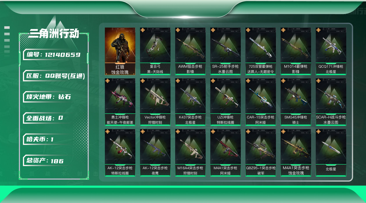 [12140659]总资产:186.3M 1干员外观 2近战传说 21传说枪械 哈夫币:1.821K 可二次 可修改实名 优质装备:近战-影锋,近战-北极星,顶级安全箱(3x3) 烽火地带段位:钻石 全面战场段位:无段位 传说武器皮肤:SR-25射手步枪-水墨云图,SCAR-H战斗步枪-水墨云图,M1014霰弹枪-影锋,AWM狙击步枪-影锋,SMG45冲锋枪-骑士,UZI冲锋枪-特斯拉线圈,M16A4突击步枪-狩猎时刻,AK-12突击步枪-特斯拉线圈,勇士冲锋枪-能天使-午夜邮差,Vector冲锋枪-狩猎时刻,复合弓-黑-天际线,K437突击步枪-北极星,QCQ171冲锋枪-北极星,725双管霰弹枪-送葬人-无题密令,M4A1突击步枪-阿米娅,CAR-15突击步枪-阿米娅,AK-12突击步枪-夜鹰,M4A1突击步枪-蚀金玫瑰,QBZ95-1突击步枪-破军 干员外观:红狼-蚀金玫瑰