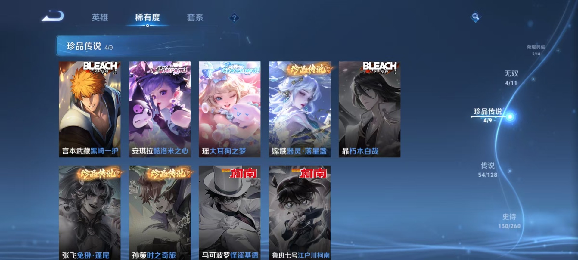 刘邦夺宝奇兵,夏侯惇朔风刀,老夫子醍醐杖,沈梦溪星空之诺,沈梦溪大漠名商,盾山御銮,曹操烛龙,苏烈千军破阵,典韦穷奇,典韦蓝屏警告,达摩沙漠行僧,牛魔御旌,项羽苍威无极,鲁班七号狮舞东方,镜青焰无极,兰陵王金庭之子,裴擒虎擒涛扼浪,鲁班大师探海日志,明世隐疑决卦,马可波罗暗影游猎,白起狰,鬼谷子原初探秘者,张良古海寻踪,女娲朔望之晖,桑启海盐诗旅,狄仁杰万华元夜,嬴政白昼王子,芈月重明,程咬金演武夺筹,扁鹊炼金王,李元芳银河之约,李元芳云中旅人,弈星混沌棋,虞姬凯尔特女王,米莱狄御霄,钟馗神迹守卫,钟馗驱傩正仪,狂铁御狮,太乙真人饕餮