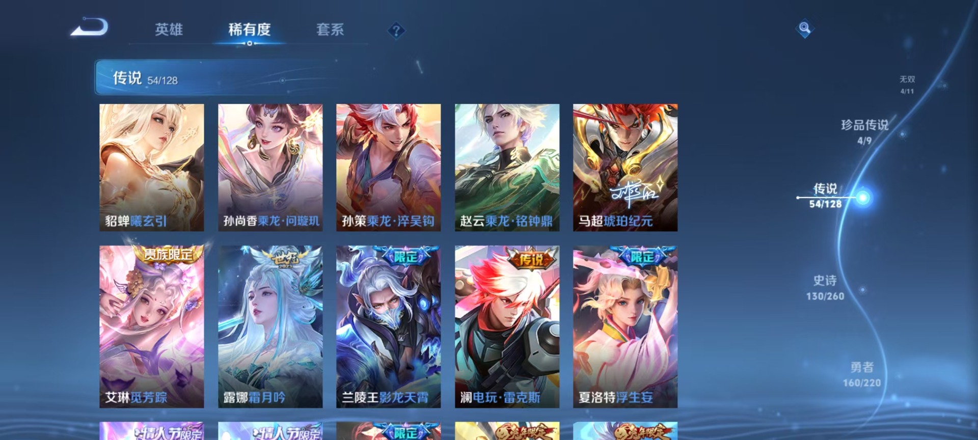铠绛天战甲,刘备时之恋人,赵云乘龙·铭钟鼎,赵云淬星耀世,孙策乘龙·淬吴钩,孙尚香乘龙·问璇玑,海月金乌负日,王昭君乞巧织情,露娜霜月吟,吕布曦玄引,镜炽阳神光,周瑜音你心动,貂蝉猫影幻舞,夏洛特浮生妄,艾琳觅芳踪,西施游龙清影,张良黄金白羊座,曜云鹰飞将,马超琥珀纪元,马超无双飞将,云中君群星魔术团,百里守约碎云,李元芳飞鸢探春,貂蝉曦玄引,云缨幻光神枪