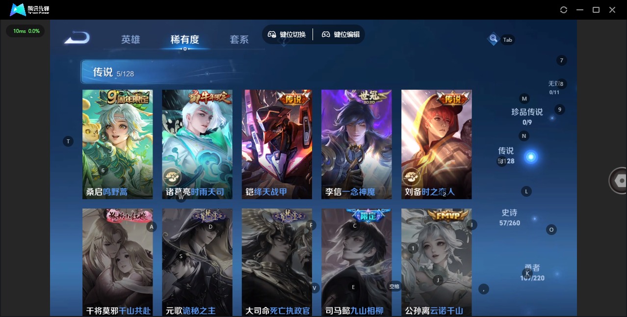 - [12025146]V7 10传说 124英雄 188皮肤 可修改实名 优质装备:云鹰飞将(小将军),绛天战甲(鸡嘴战神),一念神魔,时之恋人-刘备(电焊工),超时空战士-狄仁杰,黄金天蝎座 传说皮:典韦战鼓燎原 珍宝阁皮:妄想食味,玩趣恶龙 限定皮:愿照·九州拓(澜年限),愿照·山河定(司空震年限),鸣野蒿,五谷丰年,李小龙,梦圆繁星,山海·玄木吟(马可年限) 史诗皮:龙之律动,怒海争锋,炽弈燎原,蒙犽顽岩魄,超元猎域,百相守梦-百里守约,紫霞仙子,黄金分割率,特工魅影,江河有灵,百解令(蒙犽),冰冠公主,电玩·爆裂旋风,猫狗日记-孙策,乱世虎臣,修罗,水果甜心,天才门将,功夫厨神,暗隐猎兽者,幽灵船长,鬼剑武藏,暗渊魔法,心灵战警,天秀·启明,地狱岩魂,纤云弄巧,缤纷独角兽,乘风破浪,逐浪之夏,水晶猎龙者,金属风暴,圣诞狂欢,鹰眼统帅,暗夜贵公子,魅力维加斯