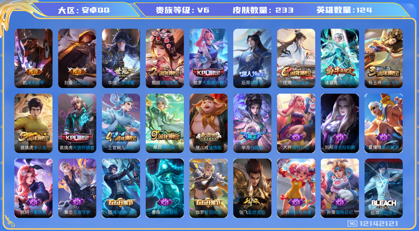 [12142121]V6 5传说 124英雄 233皮肤 可修改实名 优质装备:绛天战甲(鸡嘴战神),一念神魔,时之恋人-刘备(电焊工) 珍宝阁皮:妄想食味,女武神 限定皮:鸣野蒿,白晶晶,时雨天司(水龙头),遇见飞天,高山流水,游园惊梦,梁祝,天狼狩猎者,天狼溯光者,李小龙,如梦令-后羿,猪悟能 史诗皮:星界战将,石田雨龙,百相守梦-黄忠,紫霞仙子,电玩小子(小书包),特工魅影,千年之狐,江河有灵,蒙恬荣光圣徽,冰冠公主,末日机甲-吕布,猫狗日记-孙策,猫狗日记-大乔,乱世虎臣,节奏热浪,女仆咖啡,水果甜心,天才门将,星夜王子,功夫厨神,德古拉伯爵,暗隐猎兽者,幽灵船长,舞动绿茵,繁星吟游(呼啦呼啦),拒霜思,缤纷独角兽,乘风破浪,逐浪之夏,水晶猎龙者,曙光守护者,箭羽风息,金属风暴,原初追逐者,圣诞恋歌,鹰眼统帅,魅力维加斯,黎明之约,未来纪元-赵云