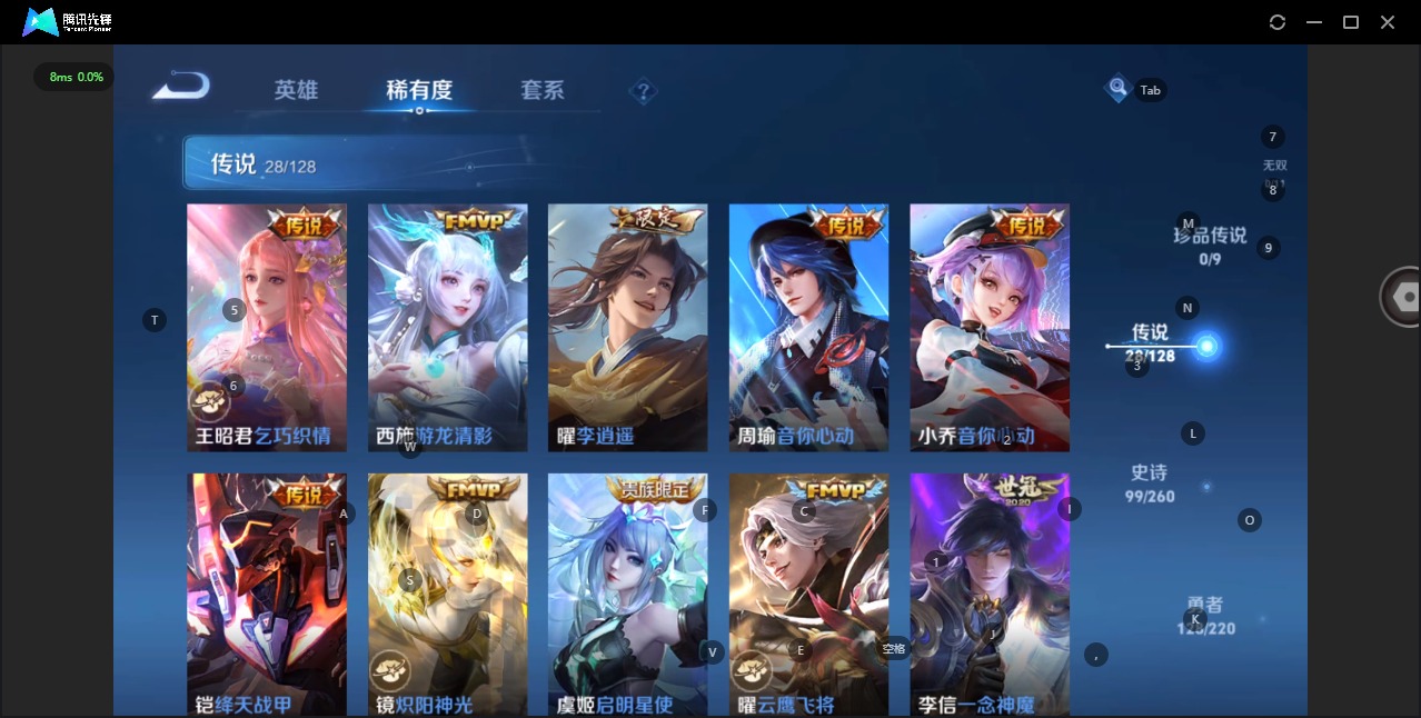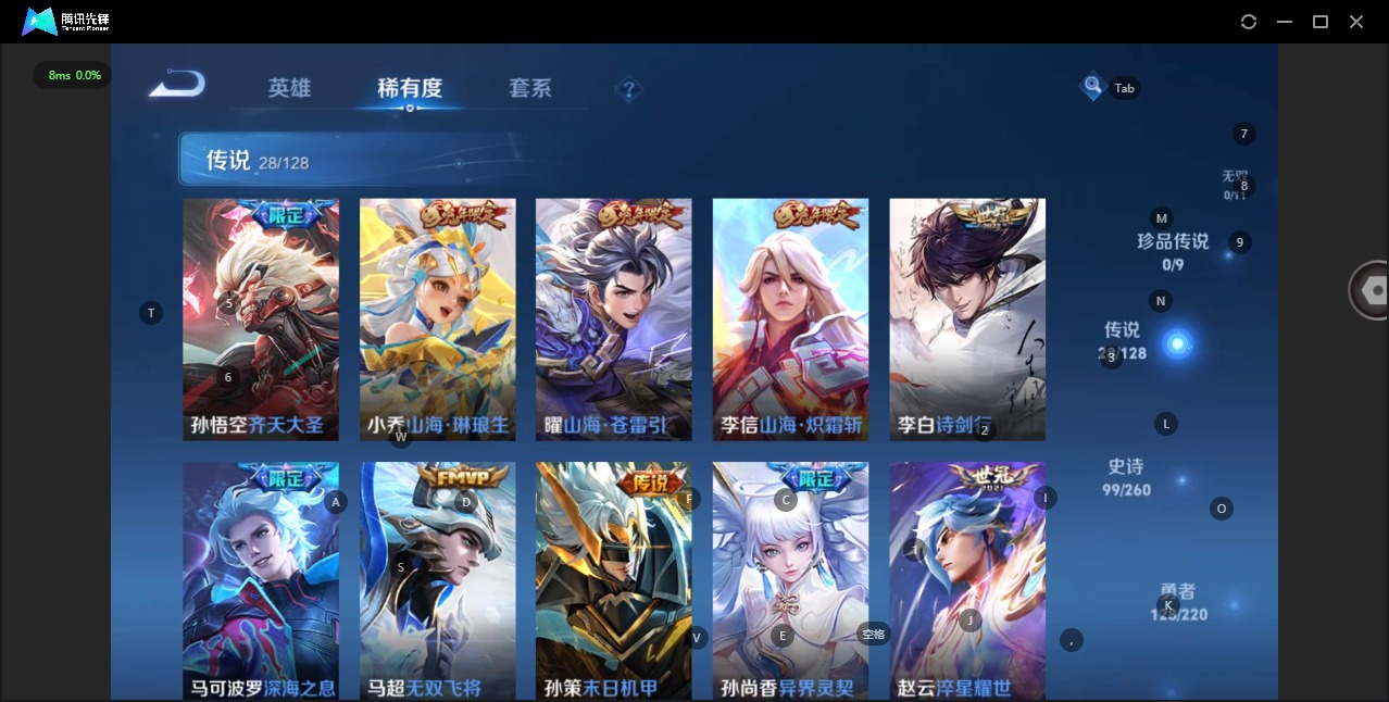 - [12110731]V8 1典藏 6传说 122英雄 233皮肤 可修改实名 优质装备:九霄神辉(木兰典藏),云鹰飞将(小将军),猫影幻舞,一念神魔,末日机甲-孙尚香(绿蚂蚱) 珍宝阁皮:胡桃夹子,蔷薇恋人 限定皮:至尊宝,神威(电光马子),飞衡(韩信年限),诗剑行,五谷丰年,梁祝,李小龙,辉光之辰,霸王别姬-项羽,青春决赛季,唐三藏,山海·玄木吟(马可年限) 史诗皮:紫霞仙子,电玩小子(小书包),黄金分割率,特工魅影,千年之狐,永昼,魅语,冰冠公主,偶像歌手,末日机甲-吕布,猫狗日记-孙策,乱世虎臣,节奏热浪,修罗,女仆咖啡,水果甜心,天才门将,星夜王子,功夫厨神,德古拉伯爵,暗隐猎兽者,幽灵船长,鬼剑武藏,舞动绿茵,地狱岩魂,纤云弄巧,缤纷独角兽,乘风破浪,逐浪之夏,月团寄思,水晶猎龙者,曙光守护者,箭羽风息,金属风暴,圣诞狂欢,圣诞恋歌,鹰眼统帅,暗夜贵公子,魅力维加斯,无心,未来纪元-赵云