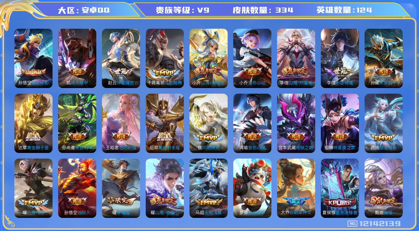 [12142139]V9 1典藏 28传说 124英雄 334皮肤 可修改实名 优质装备:全息碎影(猴子典藏),黄金狮子座,黄金射手座,云鹰飞将(小将军),绛天战甲(鸡嘴战神),久胜战神,炽阳神光,一念神魔,末日机甲-孙尚香(绿蚂蚱),地狱火,仲夏夜之梦(大飞蛾),音你心动-小乔,地狱之眼,音你心动-周瑜,胖达荣荣,李逍遥,乞巧织情,游龙清影(小青龙),淬星耀世,末日机甲-孙策,无双飞将,山海·炽霜斩(李信年限),山海·琳琅生(小乔年限),山海·苍雷引(电光曜子) 珍宝阁皮:优雅恋人,女武神,玩趣恶龙 限定皮:至尊宝,异界灵契(白毛香),傲雪梅枪,白鹤梁神女,飞衡(韩信年限),玄嵩(庄周年限),山海·碧波行(瑶年限),高山流水,诗剑行,齐天大圣,匿光决锋者,五谷丰年,冰锋战神,幽恒(沐浴露),梁祝,天狼狩猎者,逐梦之星,天狼溯光者,李小龙,逐梦之影,朱雀志(守约年限),引擎之心,乒乒小将,蜜橘之夏,匿光追影者,寅虎·心曲(虎婆),百木心枪,玉兔公主,深海之息(深海大菠萝),梦圆繁星,山海·玄木吟(马可年限) 史诗皮:遇见神鹿,紫霞仙子,黄金分割率,特工魅影,千年之狐,永昼,江河有灵,魅语,百解令(蒙犽),偶像歌手,晚萤,电玩·爆裂旋风,龙骑士(小龙虾),末日机甲-吕布,猫狗日记-孙策,猫狗日记-大乔,乱世虎臣,节奏热浪,修罗,女仆咖啡,摇滚巨星,水果甜心,天才门将,星夜王子,心灵骇客,功夫厨神,德古拉伯爵,暗隐猎兽者,幽灵船长,鬼剑武藏,暗渊魔法,心灵战警,天秀·启明,舞动绿茵,地狱岩魂,诗语江南,纤云弄巧,繁星吟游(呼啦呼啦),拒霜思,缤纷独角兽,乘风破浪,逐浪之夏,月团寄思,水晶猎龙者,曙光守护者,热力回旋,金属风暴,圣诞狂欢,圣诞恋歌,鹰眼统帅,魅力维加斯,赏金猎手,无心,未来纪元-赵云
