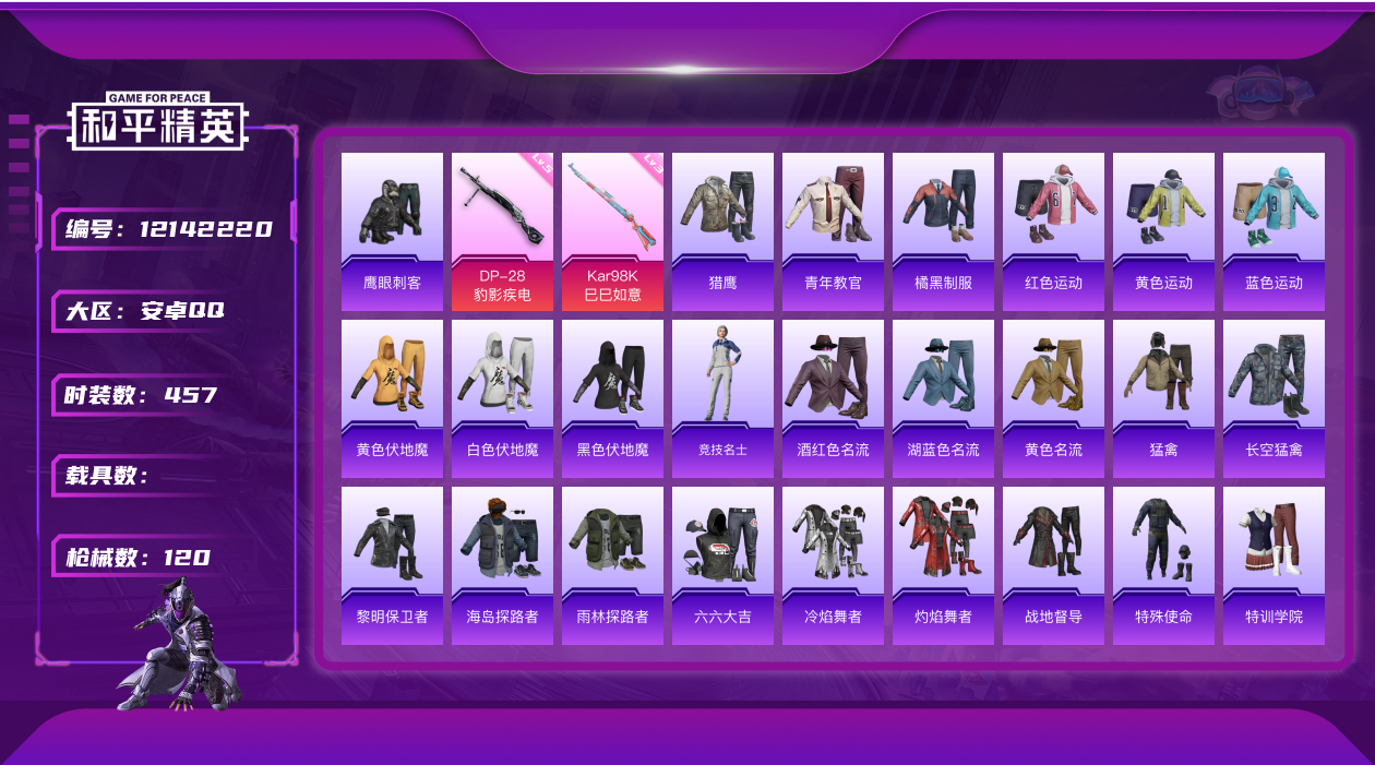 [12142220]2特效枪 4印记 可二次 可修改实名 身法装备:暗影哥特(红眼罩) 优质装备:Kar98K-巳巳如意 热门装扮:鹰眼刺客 稀有枪皮:DP-28-豹影疾电 五级特效枪:五级DP-28-豹影疾电 三级特效枪:三级Kar98K-巳巳如意 紫色装扮:幻彩翩翩,SS23特训,妙红点点,SS30特训套装,SS31特训套装,飞狐塔尔斯,SS21特训,田园牧歌,轻风白浪,SS22特训,冷焰舞者,夏日音浪,完美偶像,帅气教官,幻世战舞者,幻影武者,冰川特警,萌趣咩咩,人气偶像,六六大吉,娇憨猪猪,SS16特训,SS17特训,SS14特训,萌趣颜团子,SS15特训,SS20特训,甜心亚梦,虚音幻奏,酸甜橘柚,SS18特训,SS19特训,黄色名流,青年教官,魅力单车,鹤鸣,麻辣教官,黄色伏地魔,黄色运动,黎明保卫者,黑色伏地魔,龙的传人,龟仙人,蝶变,酷潮明星,超能勇士,都市魅力,酒红色名流,长空猛禽,雨林探路者,蓝海鲸歌,街头潮人,深蓝色名流,湖蓝色名流,滨海假日,滨海厨神,灼焰舞者,炫蓝之夏,热血青春,热血骑手,燃烧卡路里,牛气冲天,海岛探路者,战地督导,极速红龙,柠萌假日,格斗先锋,橘黑制服,沙漠兵团,特战英豪,血色贵族,竞技达人朋克,红色运动,绮丽涂鸦,缤纷果语,荧惑魅影,蓝彩潮人,蓝色运动,虎虎生威吉莉,空投萌叽,特殊使命,特训学院,猎鹰,猛禽,王牌教练,空岛之星,白熊同盟,白色伏地魔,破晓战魂,破蛋小黄鸡,福星高照,SS29特训,SS28特训,玉兔迎春,竞技名士,暗影哥特(红眼罩),惊鸿侠骨,神气柴柴,懵萌河马,SS24特训(SS24特训套装),萤火魅影(套装-荧惑魅影),SS25特训,锦衣飞扬,SS27特训,无暇誓言,SS26特训,春光漫游,快闪甜心,黑色刀锋,黑夜传说,耀粉歌者,萌黄之夏,白糯汤圆,光之冒险,冰冻风暴 优质战备:圣堂之誓降落伞,星途旅人降落伞,镜光幻境飞行器(镜光幻境飞行翼),未来歌姬降落伞,青春物语降落伞