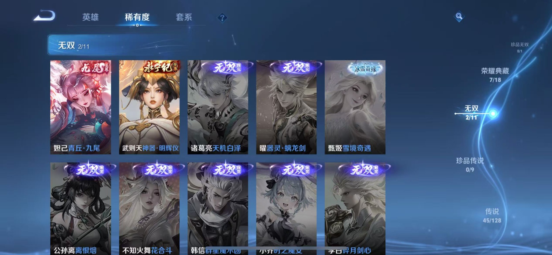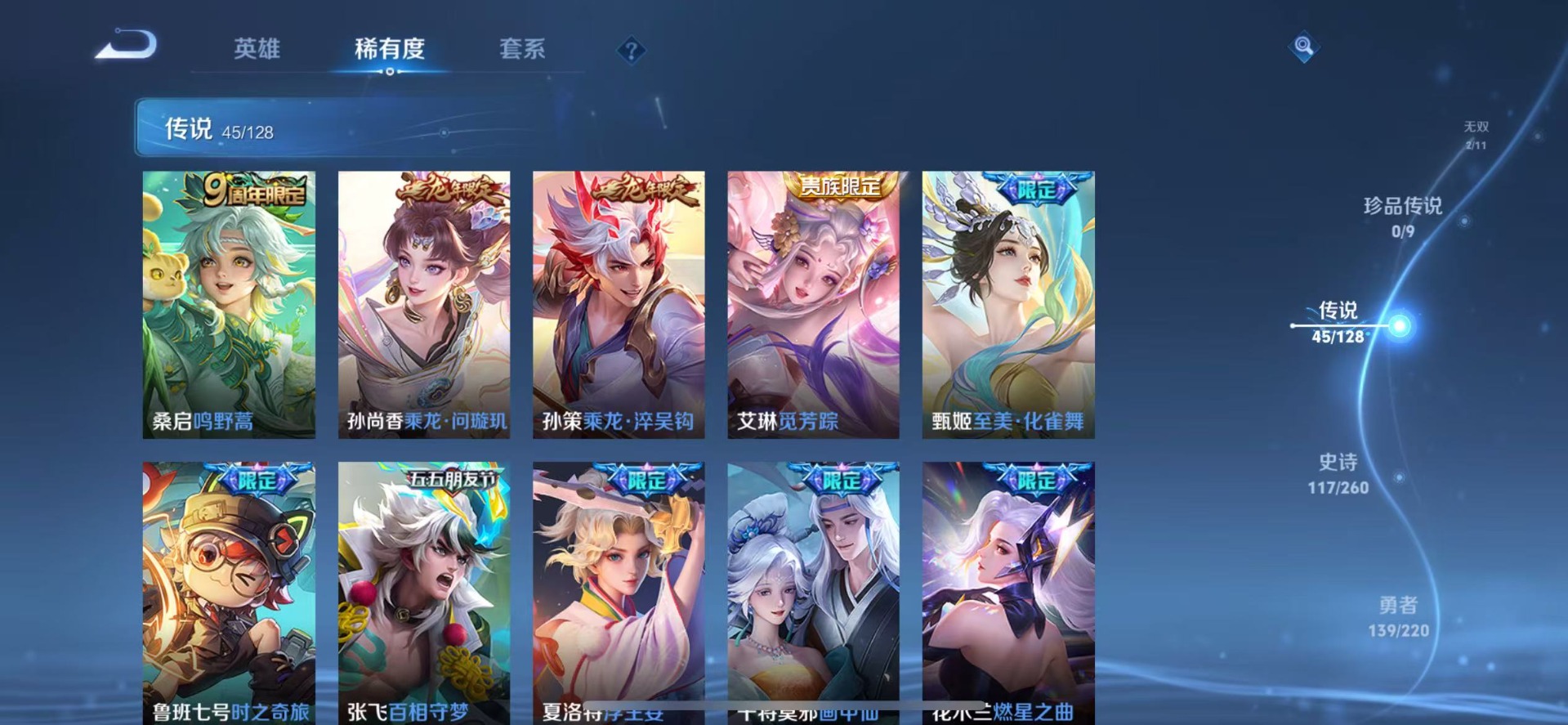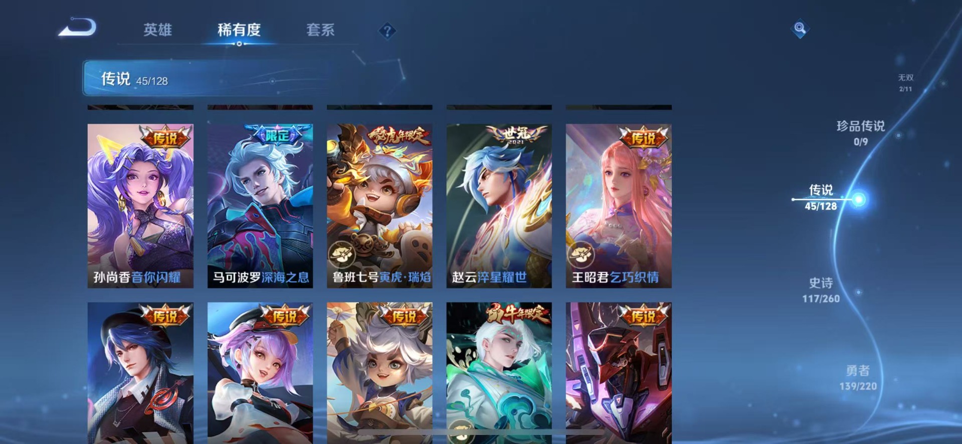 - [11603432]实名: 可修改 贵族等级: V6 英雄数: 123 皮肤数: 177 传说皮: 地狱火 限定皮: 冰锋战神,遇见飞天,李小龙,梁祝,飞衡,至尊宝,五谷丰年