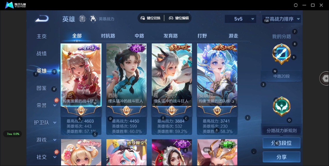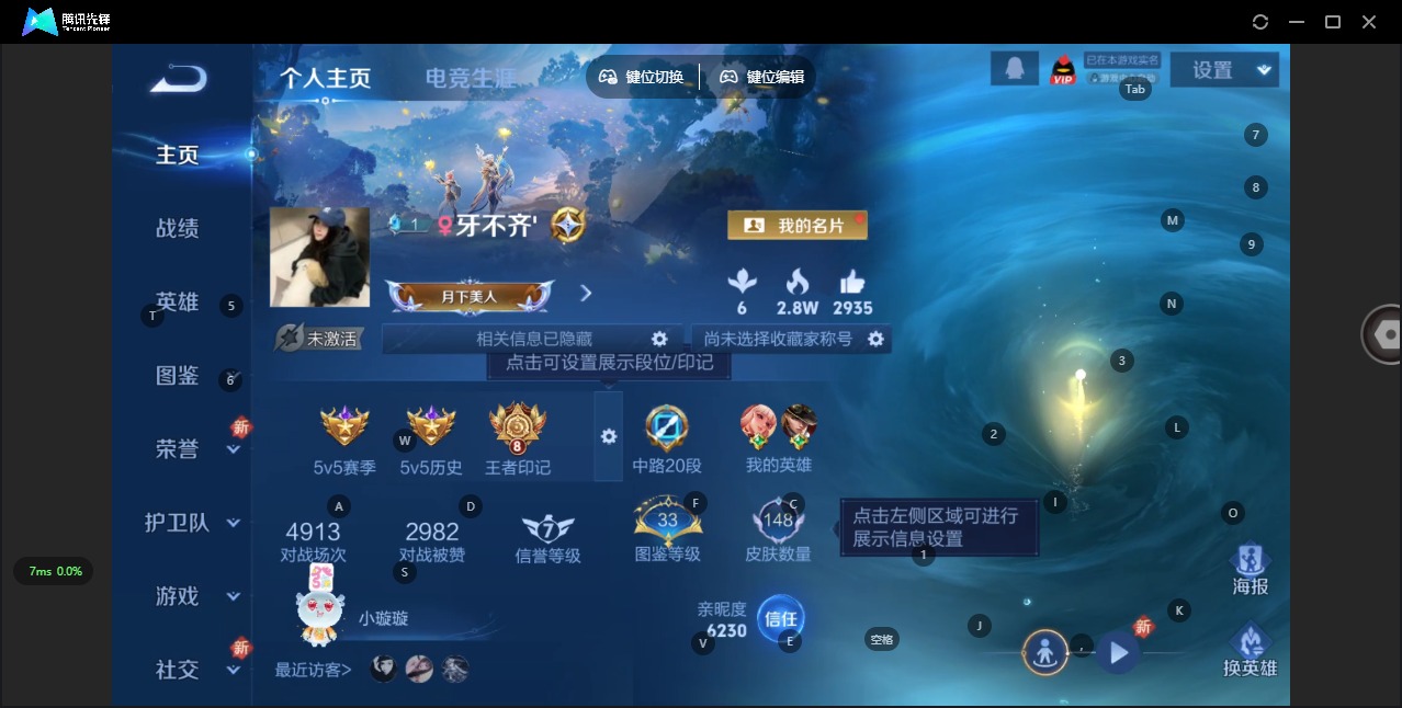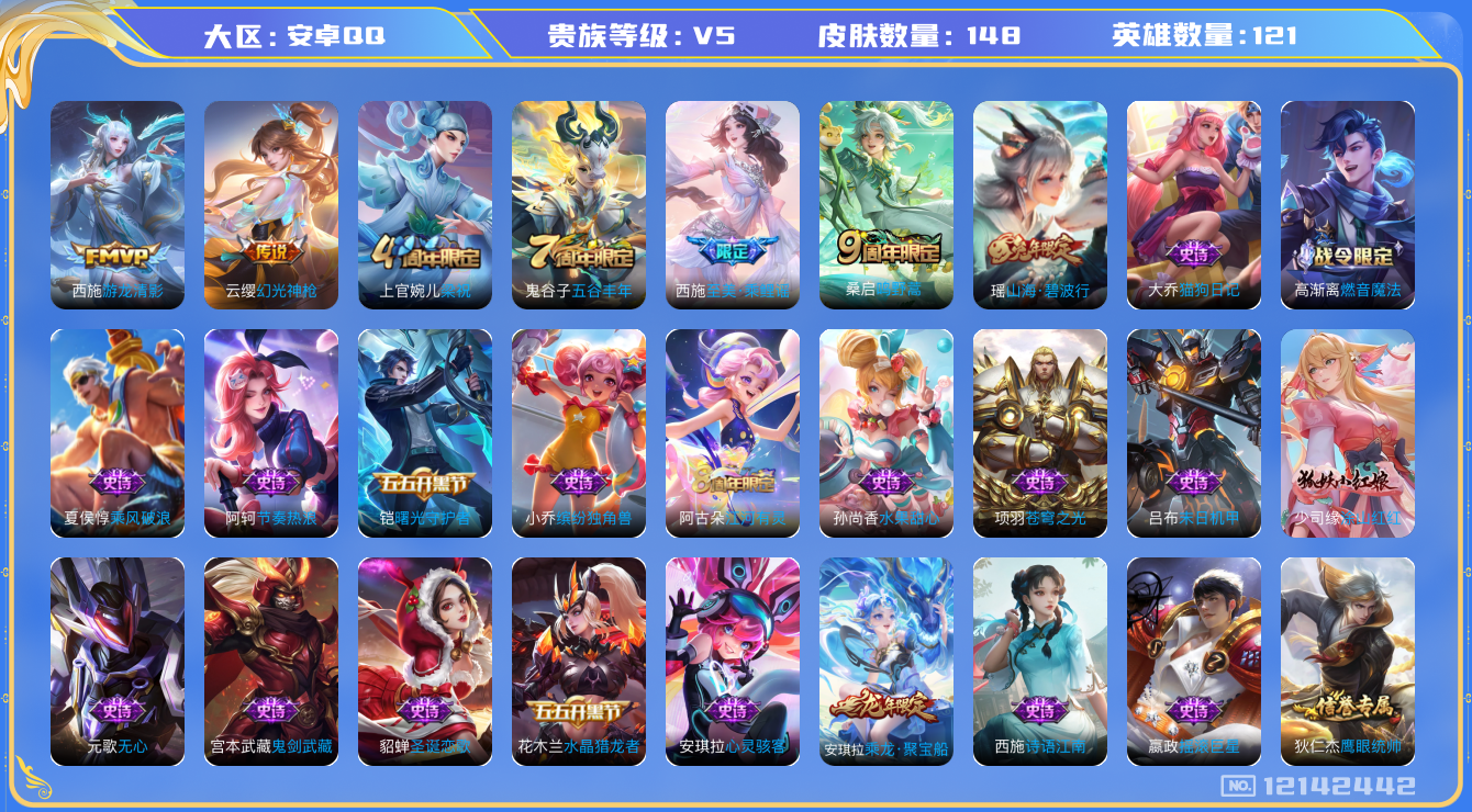 - [12200182]V7 1典藏 2珍品传说 11传说 124英雄 306皮肤 可修改实名 优质装备:九霄神辉(木兰典藏),怪盗基德,大耳狗之梦,冠军飞将,云鹰飞将(小将军),末日机甲-孙尚香(绿蚂蚱),仲夏夜之梦(大飞蛾),浮生妄,澜逐花归海,涂山容容 珍宝阁皮:优雅恋人,蔷薇恋人 限定皮:愿照·九州拓(澜年限),愿照·众生和(妲己年限),逐霄战戟,鸣野蒿,至尊宝,傲雪梅枪,绯月行,神威(电光马子),高山流水,梁祝,御风骁将(吕布年限),龙胆,李小龙,霸王别姬-虞姬,孙行者,猪悟能,大圣娶亲,引擎之心,寅虎·瑞焰(虎皮蛋子),百木心枪,天降福星,山海·玄木吟(马可年限) 史诗皮:鸭鸭历险记-刘禅,器灵·浮梦炉,绮世丹青,化蝶舞,星界战将,龙之律动,雪豹·霜爪,石田雨龙,百相守梦-周瑜,茶境仙,破空之剑,战舞者,蒙犽顽岩魄,蔬乡物语(鲁班七号),百相守梦-百里守约,百相守梦-黄忠,织梦人,紫霞仙子,苍穹之光,电玩小子(小书包),黄金分割率,特工魅影,永昼,魅语,蒙恬荣光圣徽,无限星赏官,匿光破解者,青蛇,偶像歌手,白蛇,晚萤,猫狗日记-孙策,猫狗日记-大乔,乱世虎臣,节奏热浪,修罗,女仆咖啡,摇滚巨星,水果甜心,星夜王子,心灵骇客,功夫厨神,德古拉伯爵,暗隐猎兽者,幽灵船长,鬼剑武藏,心灵战警,乐园奇幻夜,天秀·启明,舞动绿茵,地狱岩魂,繁星吟游(呼啦呼啦),拒霜思,缤纷独角兽,乘风破浪,逐浪之夏,水晶猎龙者,曙光守护者,唤灵魅影,金属风暴,圣诞狂欢,圣诞恋歌,鹰眼统帅,黎明之约,未来纪元-赵云