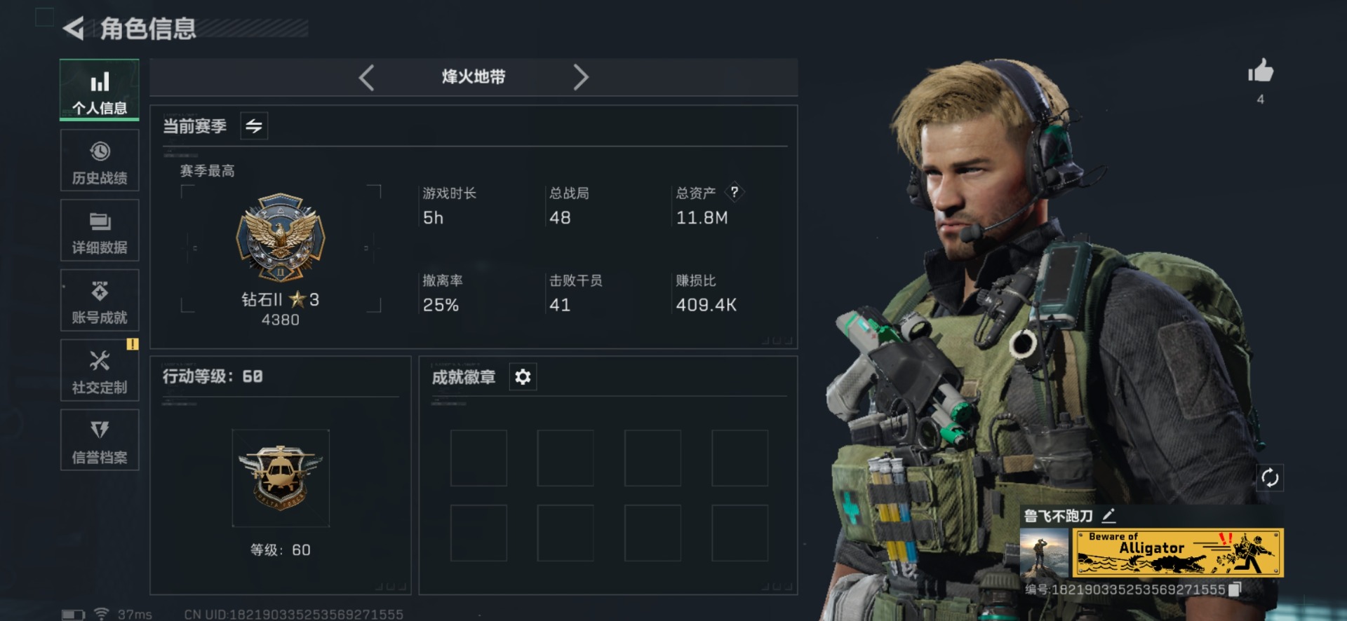 [12142628]总资产:11.8M 6传说枪械 哈夫币:322.558K 可二次 可修改实名 烽火地带段位:钻石 全面战场段位:无段位 传说武器皮肤:勇士冲锋枪-能天使-午夜邮差,M16A4突击步枪-狩猎时刻,CAR-15突击步枪-阿米娅,复合弓-黑-天际线,Vector冲锋枪-狩猎时刻,G3战斗步枪-狩猎时刻