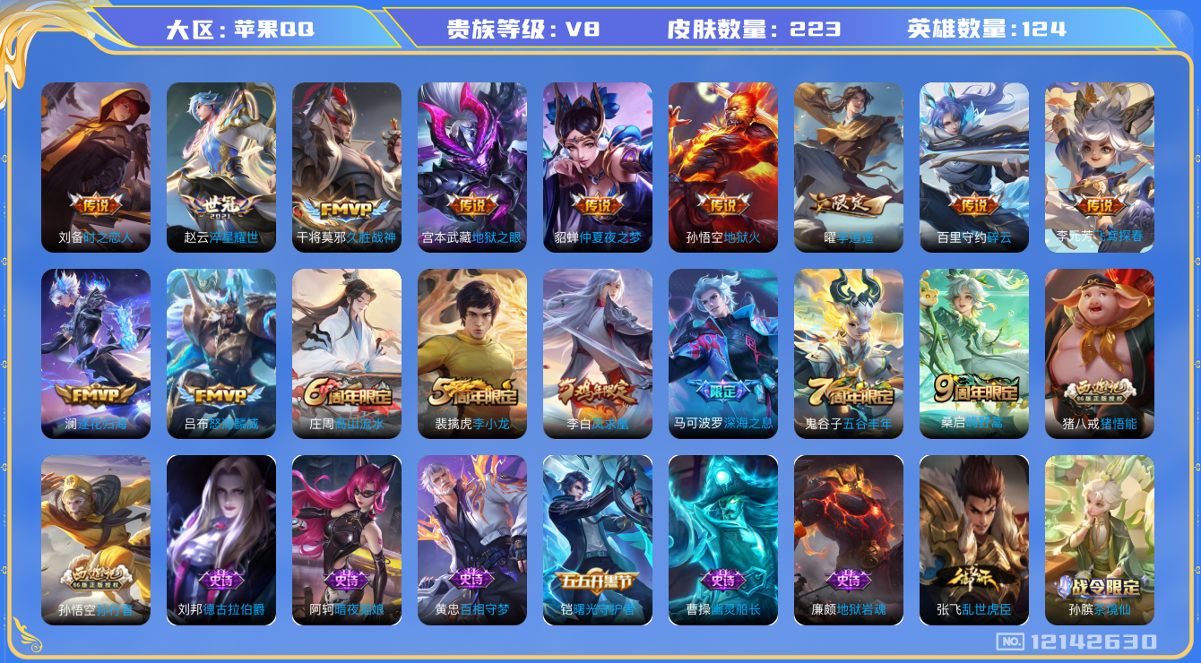 [12142630]V8 15传说 124英雄 223皮肤 可修改实名 优质装备:久胜战神,地狱火,仲夏夜之梦(大飞蛾),地狱之眼,飞鸢探春,李逍遥,时之恋人-刘备(电焊工),淬星耀世,碎云,澜逐花归海,涂山容容 珍宝阁皮:优雅恋人 限定皮:鸣野蒿,凤求凰(白切鸡),高山流水,怒海麟威,五谷丰年,李小龙,孙行者,猪悟能,深海之息(深海大菠萝) 史诗皮:鸭鸭历险记-刘禅,星界战将,石田雨龙,茶境仙,百相守梦-黄忠,星界特工,蒙犽顽岩魄,织梦人,紫霞仙子,苍穹之光,黄金分割率,特工魅影,千年之狐,魅语,偶像歌手,暗夜猫娘,末日机甲-吕布,猫狗日记-孙策,时之恋人-孙尚香,乱世虎臣,修罗,女仆咖啡,摇滚巨星,水果甜心,绅士熊喵,天才门将,星夜王子,心灵骇客,德古拉伯爵,暗隐猎兽者,幽灵船长,鬼剑武藏,舞动绿茵,地狱岩魂,水晶猎龙者,曙光守护者,热力回旋,金属风暴,原初追逐者,圣诞狂欢,圣诞恋歌,鹰眼统帅,魅力维加斯,黎明之约,千筹问战,未来纪元-赵云