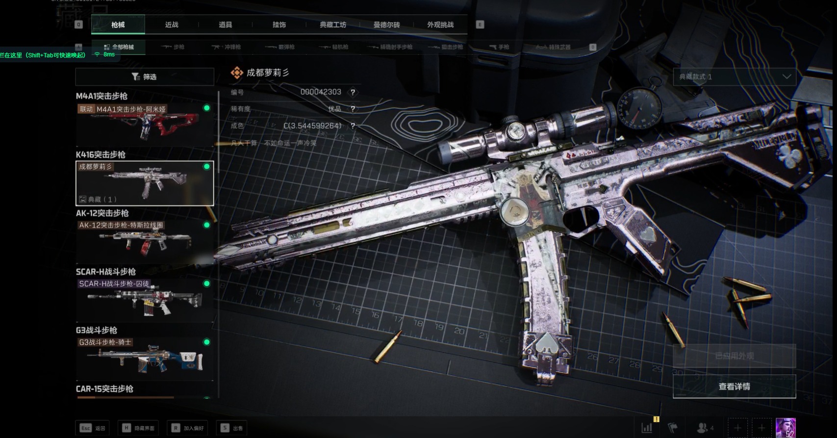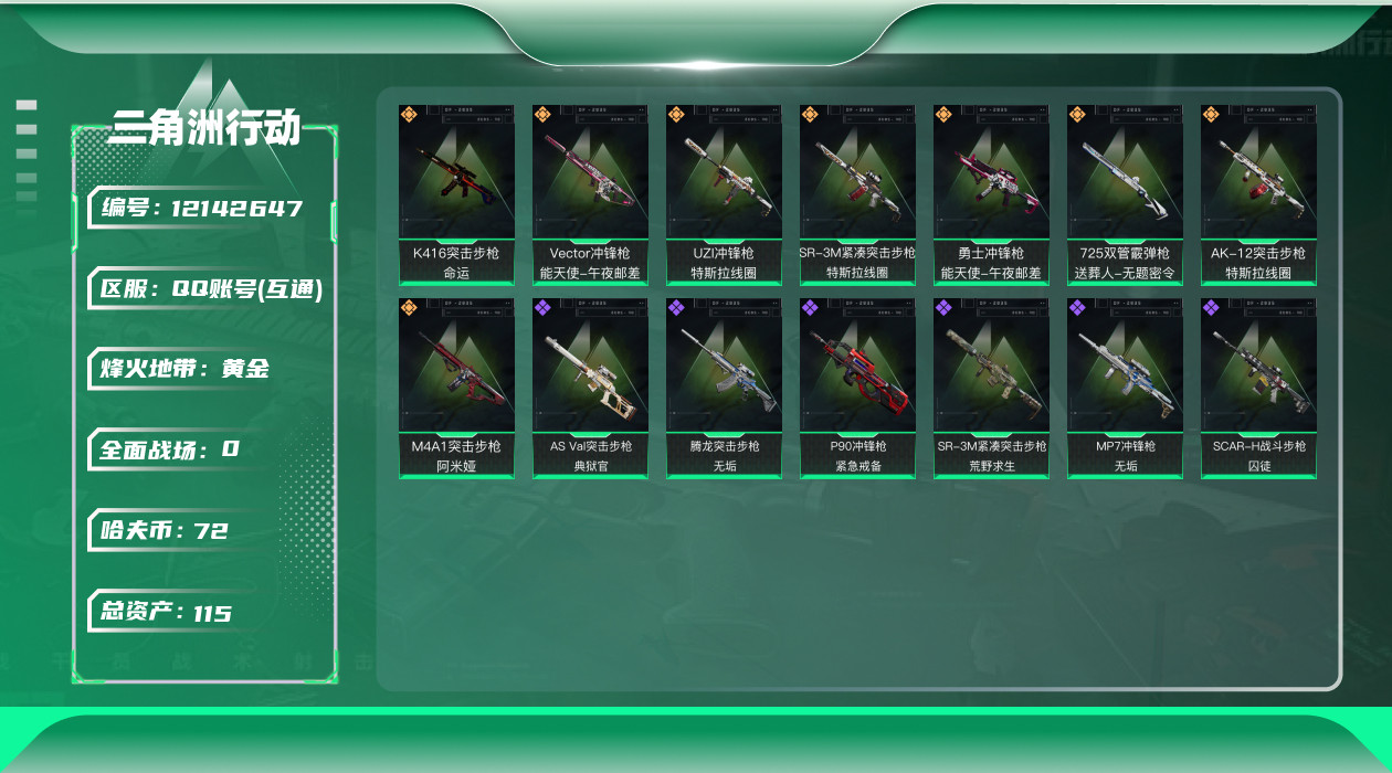 [12142647]总资产:115.3M 8传说枪械 哈夫币:72.310K 可二次 可修改实名 优质装备:K416突击步枪-命运(典藏) 烽火地带段位:黄金 全面战场段位:无段位 传说武器皮肤:AK-12突击步枪-特斯拉线圈,SR-3M紧凑突击步枪-特斯拉线圈,UZI冲锋枪-特斯拉线圈,勇士冲锋枪-能天使-午夜邮差,Vector冲锋枪-能天使-午夜邮差,725双管霰弹枪-送葬人-无题密令,M4A1突击步枪-阿米娅 史诗武器皮肤:SR-3M紧凑突击步枪-荒野求生,MP7冲锋枪-无垢,腾龙突击步枪-无垢,SCAR-H战斗步枪-囚徒,AS Val突击步枪-典狱官,P90冲锋枪-紧急戒备