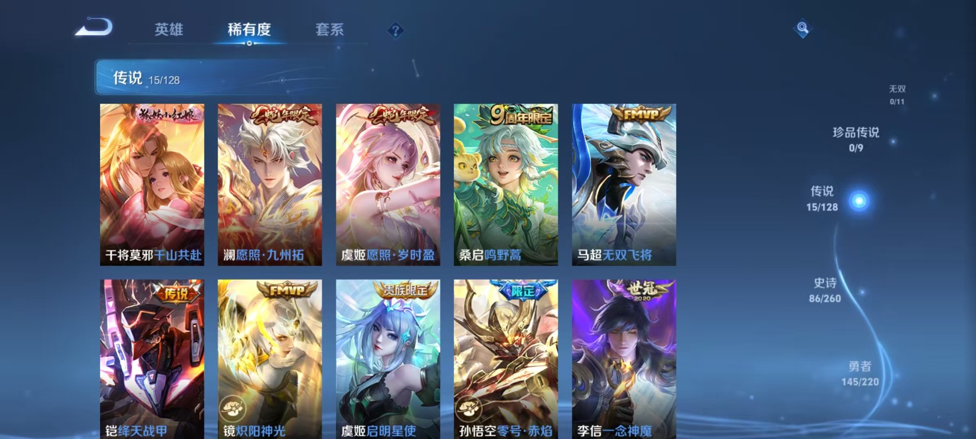 - PX_2114255-Q/荣耀黄金/164皮肤/122英雄/0典藏/0珍品无双/0无双/0珍品传说/14传说/50史诗/8稀有英雄 【14 传说皮肤】胖达荣荣 梦奇,武圣 关羽,时之祈愿 瑶,白虎志 百里玄策,云鹰飞将 曜,猫影幻舞 貂蝉,默契交锋 兰陵王,时雨天司 诸葛亮,黄金射手座 后羿,黄金狮子座 达摩,久胜战神 干将莫邪,末日机甲 孙尚香,天魔缭乱 吕布,黄金白羊座 张良, 【50 史诗皮