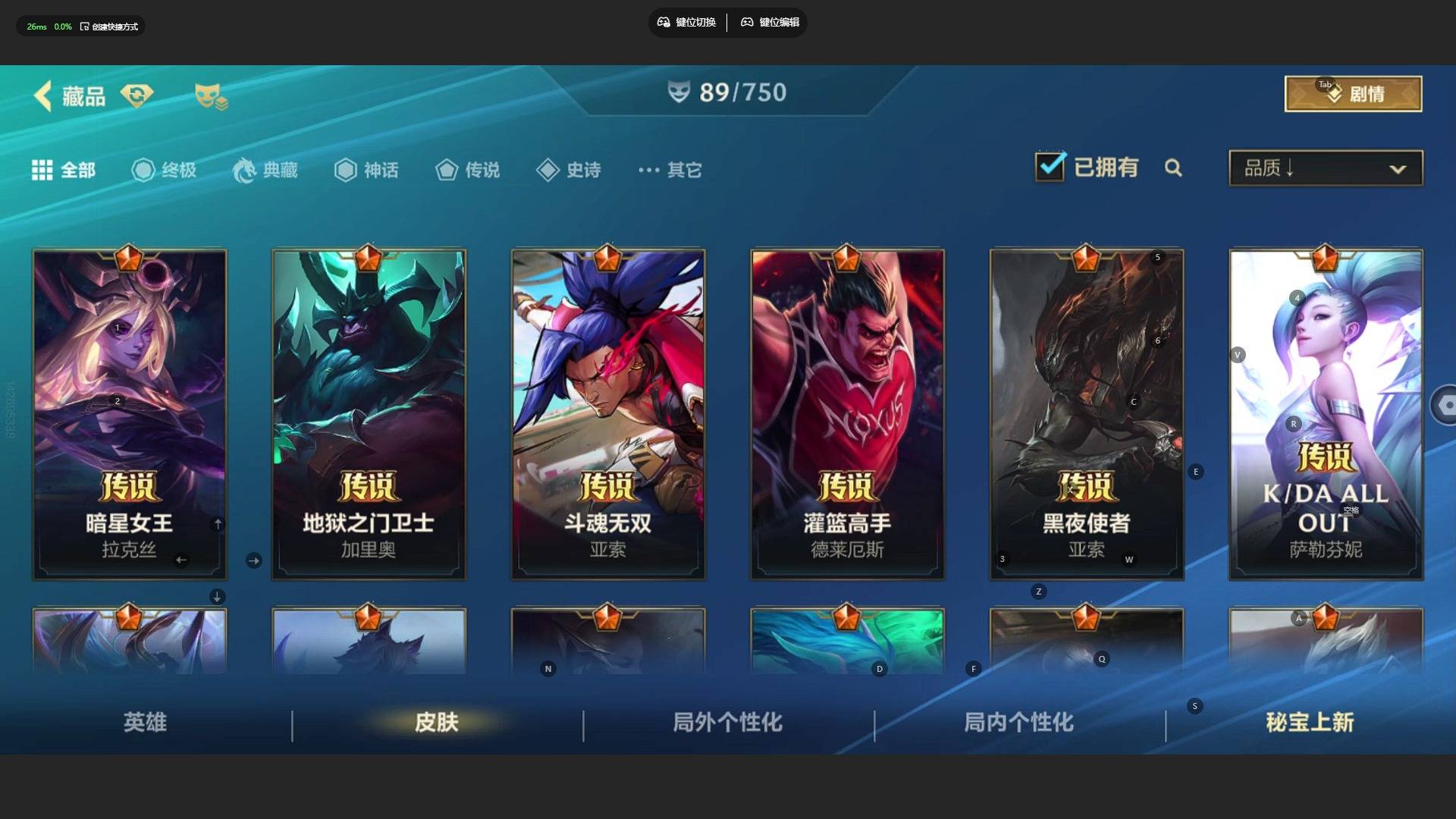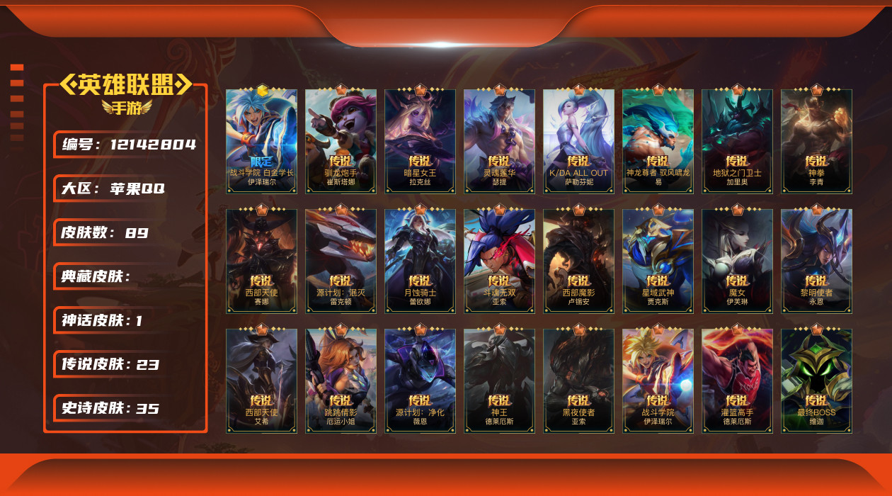 [12142804]1神话 23传说 34史诗 89皮肤 可二次 可修改实名 优质装备:灌篮高手,黑夜使者亚索,K/DA ALLOUT萨勒芬妮,神龙尊者 驭风啸龙,神拳盲僧,神王诺手,西部魔影卢锡安,西部天使寒冰,西部天使赛娜,驯龙炮手,源计划:净化,月蚀骑士蕾欧娜,战斗学院ez,玉剑传说 武剑仙,源计划:泯灭,暗星女王拉克丝,最终BOSS维迦,战斗学院EZ白金学长,跳跳倩影女枪,星域武神贾克斯,灵魂莲华腕豪,魔女伊芙琳 段位:翡翠 传说皮:斗魂无双亚索,地狱之门卫士,黎明使者永恩