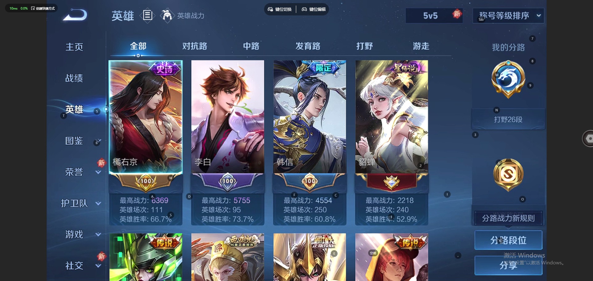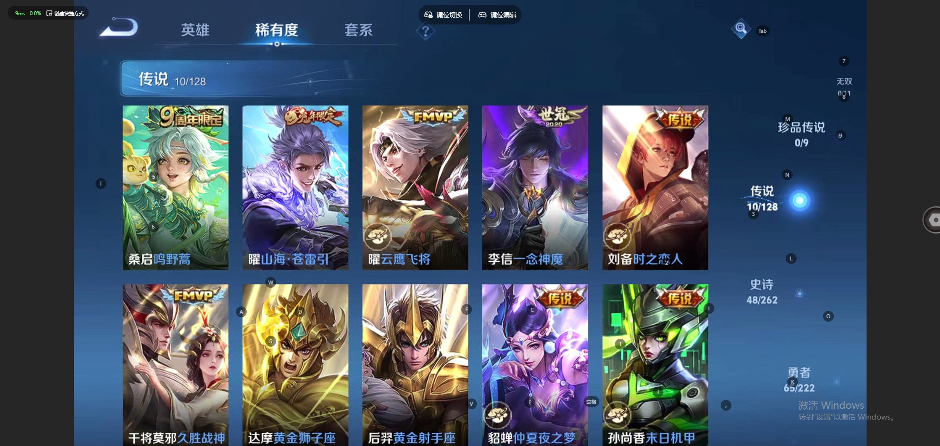 - PX_2074839-58 安卓QQ/至尊星耀/253皮肤/122英雄/2典藏/0珍品无双/0无双/1珍品传说/18传说/66史诗/7稀有英雄 【1 珍品传说】怪盗基德 马可波罗, 【2 典藏皮肤】鸣剑·曳影 李白,九霄神辉 花木兰, 【18 传说皮肤】启明星使 虞姬,电玩·雷克斯 澜,无双飞将 马超,零号·赤焰 孙悟空,云鹰飞将 曜,影龙天霄 兰陵王,炽阳神光 镜,黄金射手座 后羿,时之恋人 刘