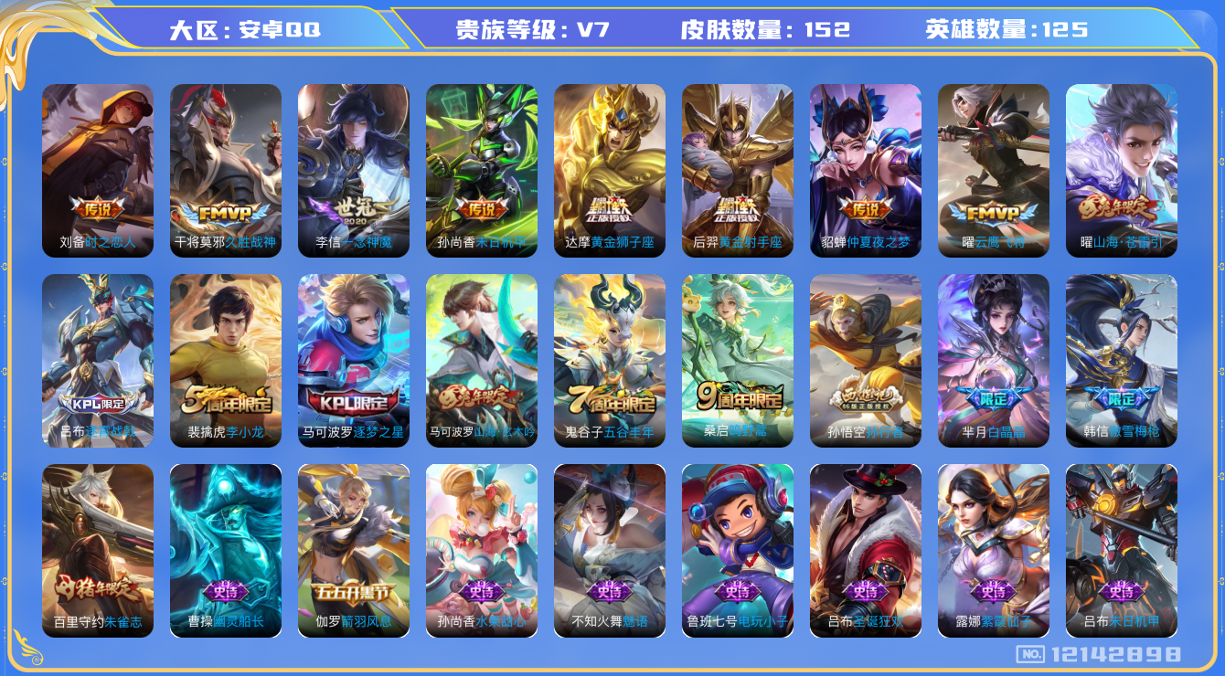 [12142898]V7 10传说 125英雄 152皮肤 可修改实名 优质装备:黄金狮子座,黄金射手座,云鹰飞将(小将军),久胜战神,一念神魔,末日机甲-孙尚香(绿蚂蚱),仲夏夜之梦(大飞蛾),时之恋人-刘备(电焊工),山海·苍雷引(电光曜子),涂山容容 珍宝阁皮:妄想食味,玩趣恶龙 限定皮:逐霄战戟,鸣野蒿,傲雪梅枪,白晶晶,五谷丰年,逐梦之星,李小龙,朱雀志(守约年限),孙行者,山海·玄木吟(马可年限) 史诗皮:紫霞仙子,电玩小子(小书包),黄金分割率,特工魅影,千年之狐,永昼,魅语,蒙恬荣光圣徽,偶像歌手,晚萤,末日机甲-吕布,修罗,女仆咖啡,水果甜心,天才门将,星夜王子,暗隐猎兽者,幽灵船长,鬼剑武藏,舞动绿茵,纤云弄巧,拒霜思,水晶猎龙者,箭羽风息,金属风暴,原初追逐者,圣诞狂欢,圣诞恋歌,鹰眼统帅,暗夜贵公子,魅力维加斯,赏金猎手,无心
