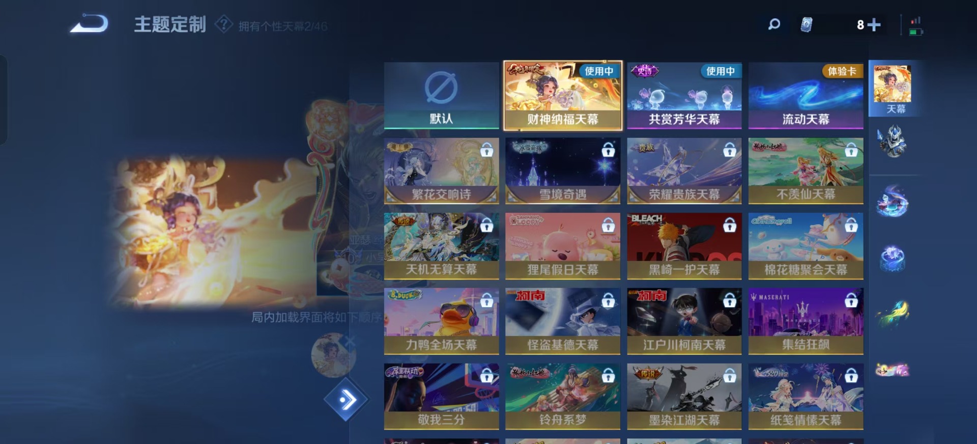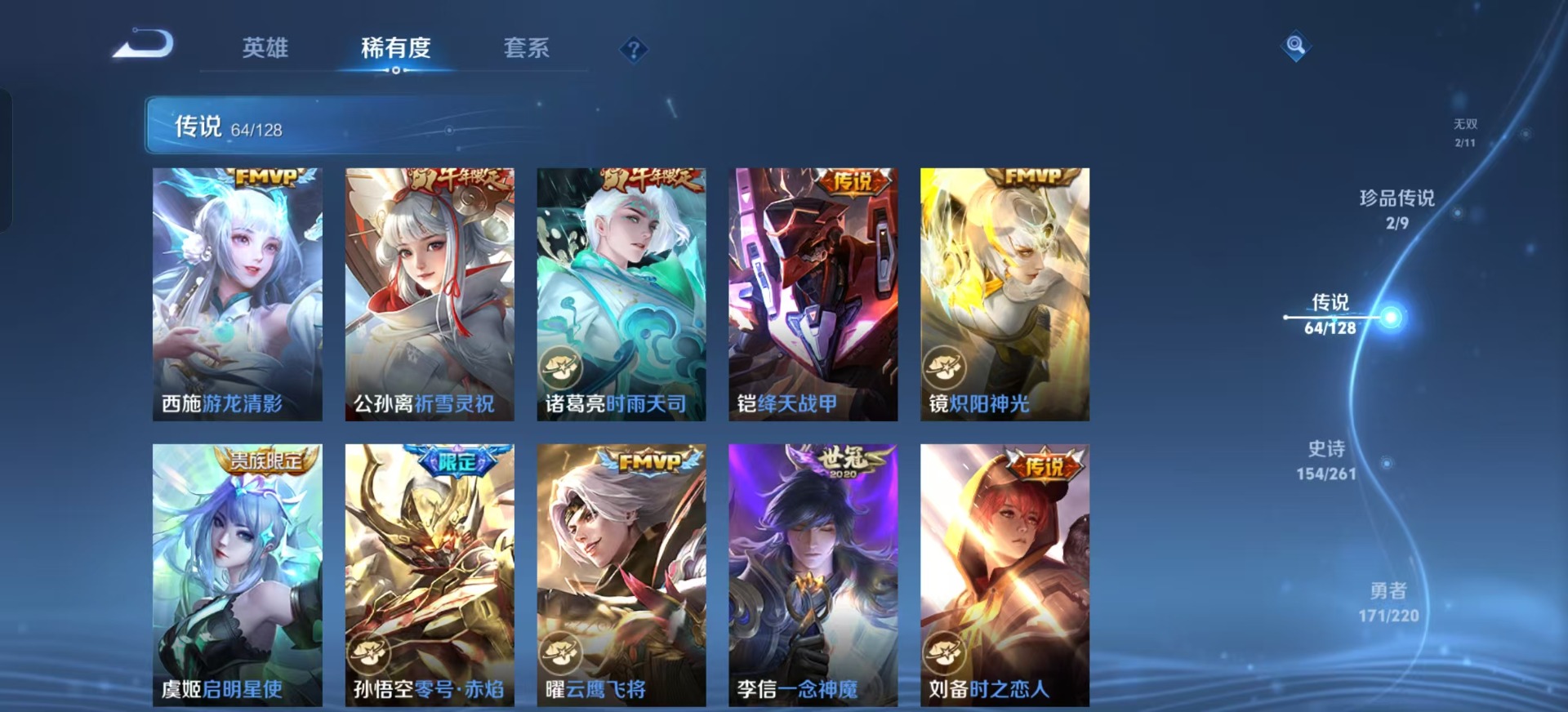 刘邦夺宝奇兵,老夫子醍醐杖,沈梦溪星空之诺,沈梦溪大漠名商,盾山御銮,苏烈千军破阵,典韦穷奇,典韦蓝屏警告,达摩沙漠行僧,牛魔御旌,项羽苍威无极,鲁班七号狮舞东方,吕布猎兽之王,镜青焰无极,元歌云间偶戏,兰陵王金庭之子,裴擒虎擒涛扼浪,鲁班大师探海日志,明世隐疑决卦,蒙犽狂想玩偶喵,马可波罗暗影游猎,鬼谷子原初探秘者,张良古海寻踪,女娲朔望之晖,桑启海盐诗旅,狄仁杰万华元夜,嬴政白昼王子,程咬金演武夺筹,李元芳云中旅人,弈星混沌棋,米莱狄御霄,钟馗神迹守卫,钟馗驱傩正仪,狂铁御狮