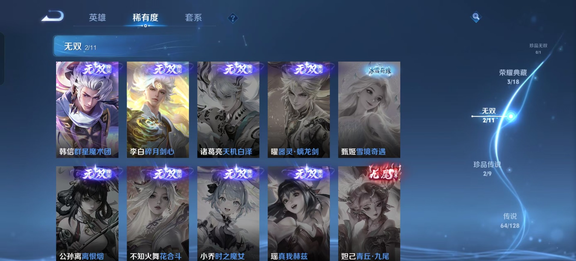 - [12084255]V9 1典藏 1无双 2珍品传说 29传说 123英雄 213皮肤 可修改实名 优质装备:九霄神辉(木兰典藏),器灵·螭龙剑,器灵·落星盏,朽木白哉,黄金狮子座,黄金射手座,云鹰飞将(小将军),黄金白羊座,久胜战神,炽阳神光,一念神魔,云霓雀翎,末日机甲-孙尚香(绿蚂蚱),仲夏夜之梦(大飞蛾),地狱之眼,李逍遥,时之恋人-刘备(电焊工),游龙清影(小青龙),淬星耀世,超时空战士-狄仁杰,挚爱之约,无双飞将,山海·炽霜斩(李信年限),遇见神鼓 传说皮:云诺千山 珍宝阁皮:蔷薇恋人,玩趣恶龙 限定皮:愿照·九州拓(澜年限),愿照·山河定(司空震年限),武陵仙君(小桃花),傲雪梅枪,补天,五谷丰年,青龙志(铠年限),祈雪灵祝(雪兔子),天狼绘梦者,朱雀志(守约年限),默契交锋-花木兰,蜜橘之夏,玉兔公主,无尽星芒,深海之息(深海大菠萝),神器·万象笔,山海·玄木吟(马可年限) 史诗皮:鸭鸭历险记-刘禅,化蝶舞,龙之律动,雪豹·霜爪,石田雨龙,茶境仙,紫霞仙子,苍穹之光,电玩小子(小书包),特工魅影,永昼,偶像歌手,魅语,无限星赏官,晚萤,青蛇,末日机甲-吕布,时之恋人-孙尚香,节奏热浪,修罗,女仆咖啡,摇滚巨星,水果甜心,天才门将,星夜王子,功夫厨神,德古拉伯爵,暗隐猎兽者,幽灵船长,鬼剑武藏,暗渊魔法,乐园奇幻夜,舞动绿茵,地狱岩魂,纤云弄巧,缤纷独角兽,乘风破浪,逐浪之夏,龙鼓争鸣,箭羽风息,唤灵魅影,金属风暴,圣诞狂欢,圣诞恋歌,鹰眼统帅,魅力维加斯,雪上飞焰,赏金猎手,奇遇舞章,滕王阁序,无心,未来纪元-赵云