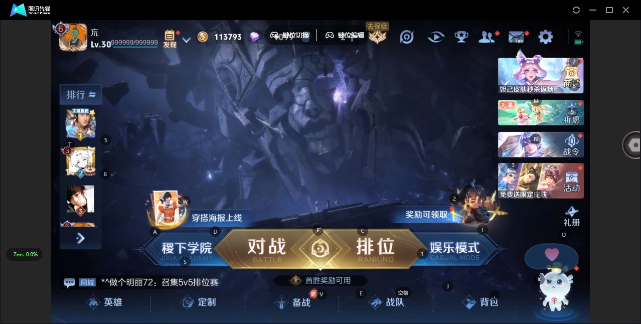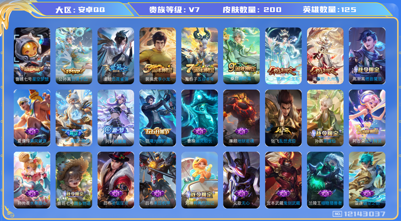 - [12279809]V7 1典藏 8传说 124英雄 190皮肤 可修改实名 优质装备:鸣剑·曳影,云鹰飞将(小将军),绛天战甲(鸡嘴战神),久胜战神,地狱火,飞鸢探春 传说皮:幻光神枪 珍宝阁皮:妄想食味 限定皮:愿照·九州拓(澜年限),鸣野蒿,飞衡(韩信年限),梁祝,岱宗(典韦年限),李小龙,大圣娶亲 史诗皮:化蝶舞,星界战将,石田雨龙,茶境仙,百相守梦-黄忠,紫霞仙子,黄金分割率,特工魅影,千年之狐,江河有灵,魅语,百解令(蒙犽),高渐离燃音魔法,无限星赏官,暗夜猫娘,猫狗日记-孙策,乱世虎臣,摇滚巨星,水果甜心,绅士熊喵,星夜王子,心灵骇客,功夫厨神,德古拉伯爵,暗隐猎兽者,幽灵船长,鬼剑武藏,乐园奇幻夜,地狱岩魂,纤云弄巧,繁星吟游(呼啦呼啦),拒霜思,缤纷独角兽,乘风破浪,逐浪之夏,水晶猎龙者,曙光守护者,金属风暴,圣诞狂欢,圣诞恋歌,鹰眼统帅,未来纪元-赵云