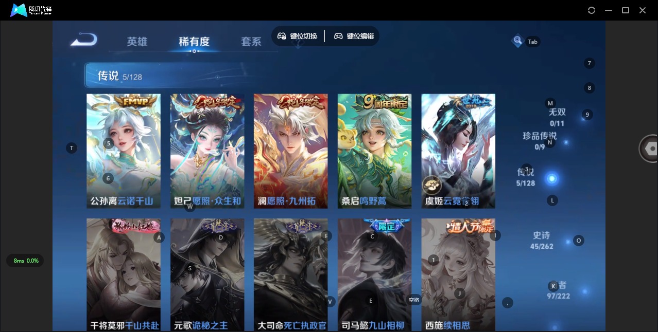 - PX_2061635-42 安卓QQ/永恒钻石/65皮肤/102英雄/0典藏/0珍品无双/0无双/0珍品传说/6传说/12史诗/5稀有英雄 【6 传说皮肤】胖达荣荣 梦奇,地狱火 孙悟空,一念神魔 李信,绛天战甲 铠,愿照·九州拓 澜,幻光神枪 云缨, 【12 史诗皮肤】末日机甲 吕布,紫霞仙子 露娜,五谷丰年 鬼谷子,鬼剑武藏 宫本武藏,魅力维加斯 妲己,鹰眼统帅 狄仁杰,孙行者 孙悟空,特工魅