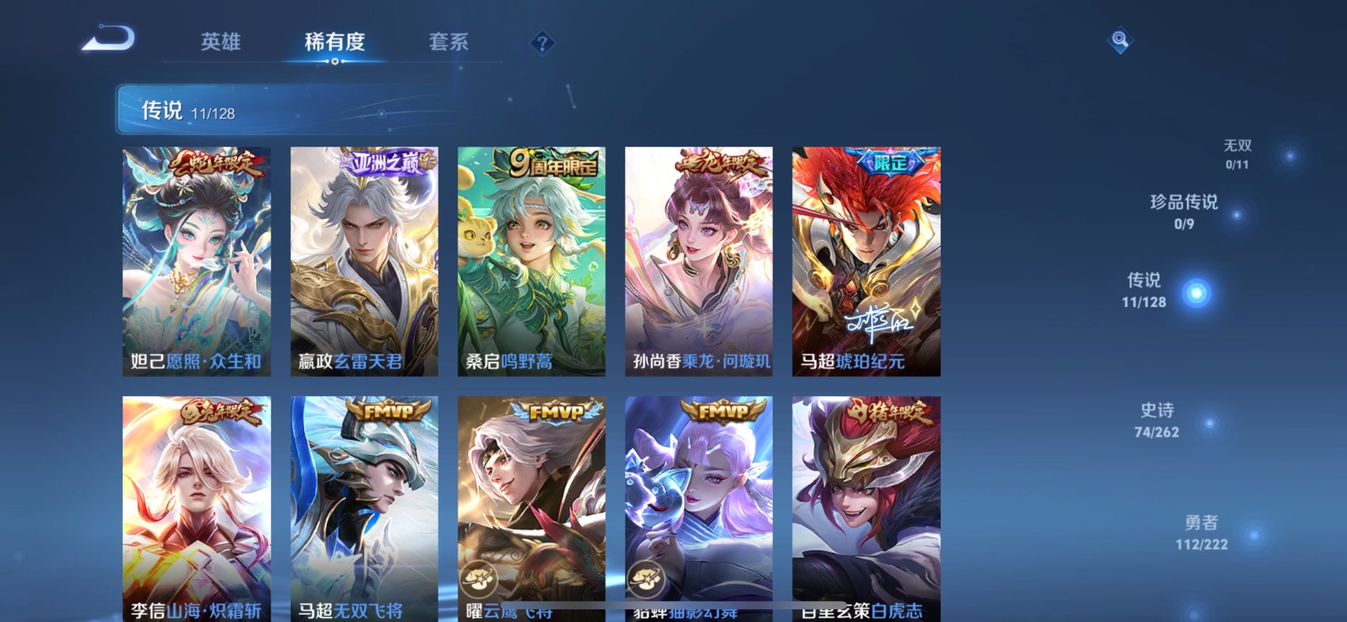 赵云龙胆,裴擒虎李小龙,上官婉儿梁祝,花木兰默契交锋,艾琳陌上桑,桑启鸣野蒿,孙悟空大圣娶亲,孙悟空至尊宝,百里玄策白虎志,赵云引擎之心,妲己愿照·众生和
