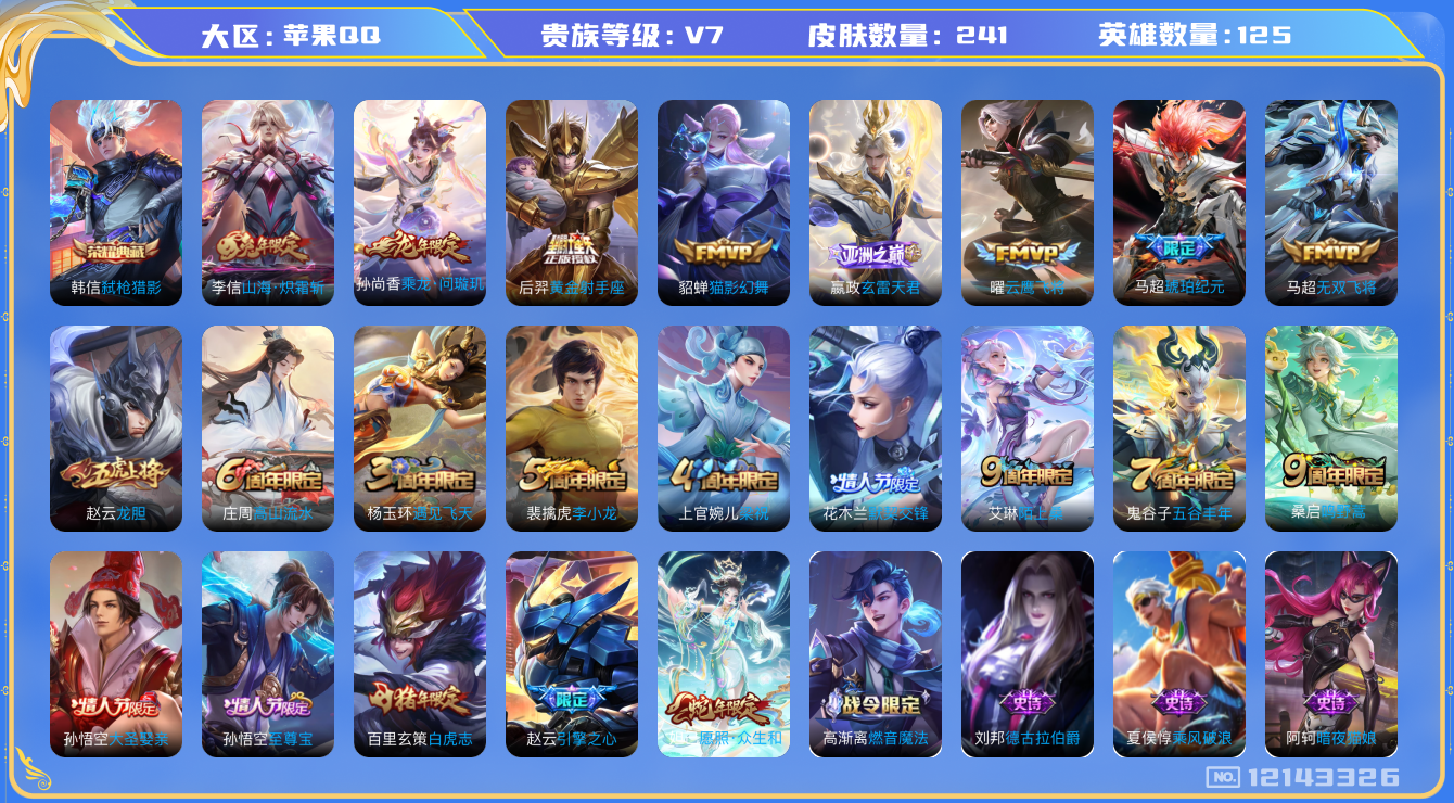 [12143326]V7 1典藏 11传说 125英雄 241皮肤 可修改实名 优质装备:弑枪猎影(韩信典藏),黄金射手座,云鹰飞将(小将军),猫影幻舞,无双飞将,山海·炽霜斩(李信年限),琥珀纪元马超,玄雷天君,涂山容容 传说皮:乘龙·问璇玑(孙尚香年限) 珍宝阁皮:优雅恋人,蔷薇恋人,女武神 限定皮:愿照·众生和(妲己年限),陌上桑,鸣野蒿,至尊宝,白虎志(电光耗子),遇见飞天,高山流水,五谷丰年,梁祝,龙胆,李小龙,默契交锋-花木兰,大圣娶亲,引擎之心 史诗皮:龙之律动,百相守梦-周瑜,破空之剑,琥珀纪元伽罗,织梦人,白龙吟,黄金分割率,特工魅影,千年之狐,永昼,江河有灵,真我赫兹(百里守约),高渐离燃音魔法,蒙恬荣光圣徽,青蛇,偶像歌手,电玩·爆裂旋风,暗夜猫娘,末日机甲-吕布,猫狗日记-孙策,时之恋人-孙尚香,乱世虎臣,节奏热浪,女仆咖啡,摇滚巨星,水果甜心,天才门将,星夜王子,心灵骇客,功夫厨神,德古拉伯爵,暗隐猎兽者,幽灵船长,鬼剑武藏,心灵战警,地狱岩魂,纤云弄巧,繁星吟游(呼啦呼啦),缤纷独角兽,乘风破浪,水晶猎龙者,曙光守护者,箭羽风息,金属风暴,圣诞狂欢,鹰眼统帅,暗夜贵公子,魅力维加斯,黎明之约,奇遇舞章,无心,未来纪元-赵云