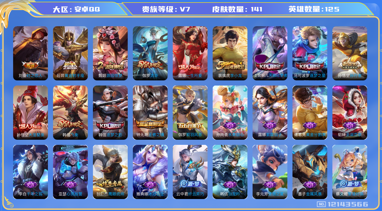 [12143566]V7 3传说 125英雄 141皮肤 可修改实名 优质装备:黄金射手座,时之恋人-刘备(电焊工) 限定皮:太华(伽罗年限),飞衡(韩信年限),游园惊梦,逐梦之星,天狼绘梦者,李小龙,逐梦之影,孙行者,一生所爱,大圣娶亲 史诗皮:龙之律动,紫霞仙子,白龙吟,黄金分割率,千年之狐,冰冠公主,水果甜心,心灵战警,纤云弄巧,繁星吟游(呼啦呼啦),逐浪之夏,箭羽风息,金属风暴,圣诞恋歌,鹰眼统帅,王者之锤,魅力维加斯