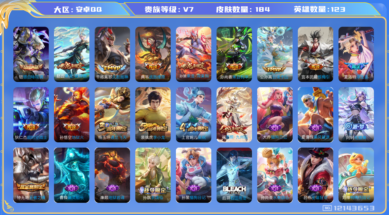 [12143653]V7 1典藏 11传说 123英雄 184皮肤 可修改实名 优质装备:银白咏叹调(倪克斯侍卫),久胜战神,末日机甲-孙尚香(绿蚂蚱),地狱火,超时空战士-狄仁杰,浮生妄,惊梅引 传说皮:乘龙·铭钟鼎(赵云年限),乘龙·淬吴钩(孙策年限),典韦战鼓燎原,云诺千山 珍宝阁皮:妄想食味,蔷薇恋人 限定皮:愿照·九州拓(澜年限),遇见飞天,梁祝,李小龙 史诗皮:鸭鸭历险记-刘禅,化蝶舞,龙之律动,石田雨龙,茶境仙,晚萤,龙骑士(小龙虾),猫狗日记-孙策,猫狗日记-大乔,修罗,水果甜心,绅士熊喵,功夫厨神,幽灵船长,心灵战警,天秀·启明,地狱岩魂,纤云弄巧,乘风破浪,金属风暴,原初追逐者,圣诞狂欢,鹰眼统帅,王者之锤,魅力维加斯,黎明之约