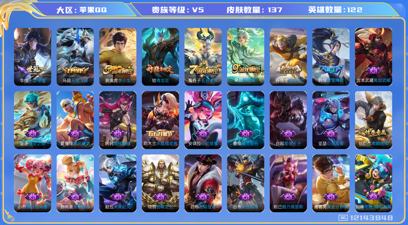 - [11995129]V10 4典藏 2无双 43传说 125英雄 468皮肤 可修改实名 优质装备:天鹅之梦(小乔典藏),无限飓风号(高达),全息碎影(猴子典藏),星域神启(倪克斯贼亮),青丘·九尾(妲己无双),器灵·螭龙剑,黄金狮子座,黄金射手座,冠军飞将,云鹰飞将(小将军),炽阳神光,一念神魔,末日机甲-孙尚香(绿蚂蚱),地狱火,仲夏夜之梦(大飞蛾),音你心动-小乔,零号·赤焰,地狱之眼,李逍遥,乞巧织情,时之恋人-刘备(电焊工),游龙清影(小青龙),超时空战士-狄仁杰,碎云,山海·炽霜斩(李信年限),山海·苍雷引(电光曜子),燃星之曲,浮生妄,青丘·九尾,灼幽烈阳,惊梅引,遇见神鼓,霜月吟,澜逐花归海,艾琳觅芳踪,琥珀纪元铠,黄金天蝎座,千山共赴,涂山容容 传说皮:典韦战鼓燎原,幻光神枪 珍宝阁皮:妄想食味,优雅恋人,蔷薇恋人 限定皮:愿照·山河定(司空震年限),逐霄战戟,鸣野蒿,至尊宝,傲雪梅枪,补天,白晶晶,时雨天司(水龙头),神威(电光马子),遇见飞天,高山流水,诗剑行,怒海麟威,五谷丰年,青龙志(铠年限),冰锋战神,游园惊梦,梁祝,御风骁将(吕布年限),天狼狩猎者,龙胆,逐梦之星,岱宗(典韦年限),奔雷神使(牛魔年限),李小龙,逐梦之影,玄武志(苏烈年限),朱雀志(守约年限),霸王别姬-项羽,大圣娶亲,引擎之心,天魔缭乱,青春决赛季,云端筑梦师,美猴王,女儿国国王,深海之息(深海大菠萝),枫霜尽,山海·玄木吟(马可年限) 史诗皮:鸭鸭历险记-刘禅,器灵·浮梦炉,化蝶舞,灵蛊蚀心,星界战将,龙之律动,石田雨龙,茶境仙,怒海争锋,破空之剑,蒙犽顽岩魄,琥珀纪元伽罗,蔬乡物语(鲁班七号),百相守梦-百里守约,紫霞仙子,苍穹之光,电玩小子(小书包),黄金分割率,特工魅影,千年之狐,江河有灵,鹤归松栖(赵怀真),雪夜绮愿(周瑜),完美假期,魅语,百解令(蒙犽),高渐离燃音魔法,蒙恬荣光圣徽,无限星赏官,匿光破解者,冰冠公主,青蛇,偶像歌手,白蛇,晚萤,电玩·爆裂旋风,百相守梦(刘备),暗夜猫娘,龙骑士(小龙虾),末日机甲-吕布,猫狗日记-孙策,猫狗日记-大乔,时之恋人-孙尚香,乱世虎臣,节奏热浪,修罗,女仆咖啡,摇滚巨星,水果甜心,绅士熊喵,天才门将,星夜王子,心灵骇客,时之奇旅-安琪拉,功夫厨神,德古拉伯爵,暗隐猎兽者,幽灵船长,鬼剑武藏,暗渊魔法,心灵战警,乐园奇幻夜,天秀