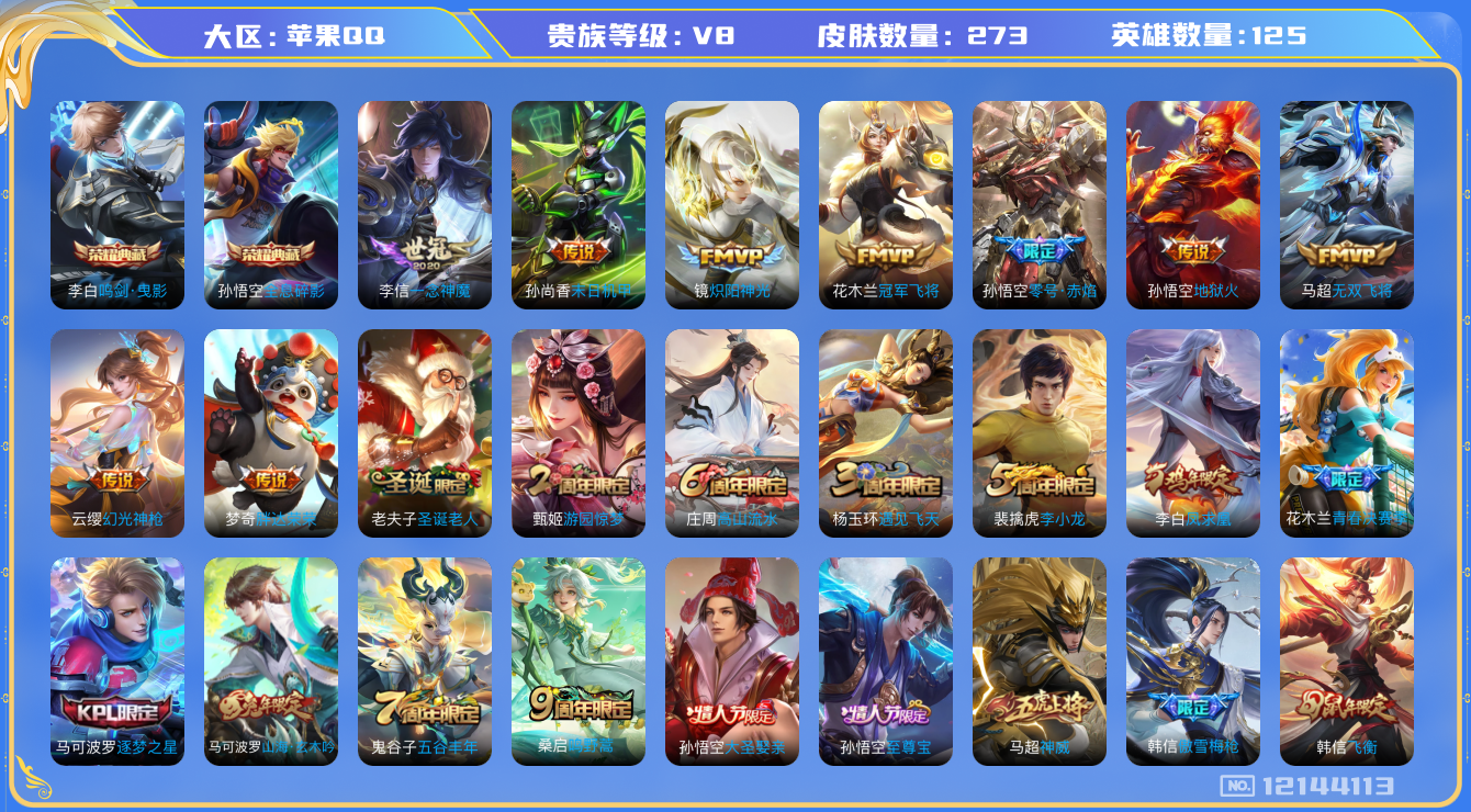 [12144113]V8 2典藏 13传说 125英雄 273皮肤 可修改实名 优质装备:鸣剑·曳影,全息碎影(猴子典藏),冠军飞将,炽阳神光,一念神魔,末日机甲-孙尚香(绿蚂蚱),地狱火,零号·赤焰,胖达荣荣,无双飞将,涂山容容 传说皮:幻光神枪 珍宝阁皮:优雅恋人,玩趣恶龙 限定皮:鸣野蒿,至尊宝,凤求凰(白切鸡),傲雪梅枪,神威(电光马子),飞衡(韩信年限),遇见飞天,高山流水,五谷丰年,冰锋战神,武圣,游园惊梦,逐梦之星,李小龙,朱雀志(守约年限),霸王别姬-虞姬,圣诞老人,大圣娶亲,青春决赛季,山海·玄木吟(马可年限) 史诗皮:石田雨龙,紫霞仙子,电玩小子(小书包),白龙吟,黄金分割率,千年之狐,魅语,蒙恬荣光圣徽,冰冠公主,偶像歌手,晚萤,末日机甲-吕布,猫狗日记-孙策,猫狗日记-大乔,乱世虎臣,节奏热浪,修罗,女仆咖啡,摇滚巨星,水果甜心,绅士熊喵,天才门将,星夜王子,功夫厨神,德古拉伯爵,暗隐猎兽者,幽灵船长,鬼剑武藏,心灵战警,舞动绿茵,纤云弄巧,拒霜思,缤纷独角兽,乘风破浪,逐浪之夏,月团寄思,水晶猎龙者,箭羽风息,金属风暴,原初追逐者,圣诞狂欢,圣诞恋歌,鹰眼统帅,魅力维加斯,黎明之约,赏金猎手,无心,未来纪元-赵云
