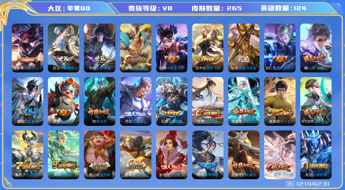 [12144231]V8 1典藏 16传说 124英雄 265皮肤 可修改实名 优质装备:杀手不太冷,冠军飞将,黄金白羊座,一念神魔,云霓雀翎,仲夏夜之梦(大飞蛾),胖达荣荣,淬星耀世,超时空战士-狄仁杰,山海·苍雷引(电光曜子),遇见神鼓,涂山容容 珍宝阁皮:胡桃夹子,蔷薇恋人,女武神 限定皮:愿照·岁时盈(虞姬年限),鸣野蒿,傲雪梅枪,时雨天司(水龙头),无限倾心-项羽,高山流水,怒海麟威,五谷丰年,青龙志(铠年限),冰锋战神,李小龙,朱雀志(守约年限),孙行者,猪悟能,大圣娶亲,山海·玄木吟(马可年限) 史诗皮:狼魂孤将,星界战将,龙之律动,百相守梦-黄忠,遇见神鹿,紫霞仙子,电玩小子(小书包),特工魅影,永昼,江河有灵,真我赫兹(镜),真我赫兹(百里守约),蒙恬荣光圣徽,无限星赏官,青蛇,偶像歌手,晚萤,百相守梦(刘备),末日机甲-吕布,猫狗日记-孙策,乱世虎臣,修罗,女仆咖啡,摇滚巨星,水果甜心,绅士熊喵,星夜王子,心灵骇客,功夫厨神,德古拉伯爵,暗隐猎兽者,幽灵船长,鬼剑武藏,舞动绿茵,纤云弄巧,拒霜思,缤纷独角兽,乘风破浪,逐浪之夏,水晶猎龙者,曙光守护者,箭羽风息,金属风暴,原初追逐者,圣诞狂欢,圣诞恋歌,鹰眼统帅,魅力维加斯,赏金猎手,无心,玫瑰异探