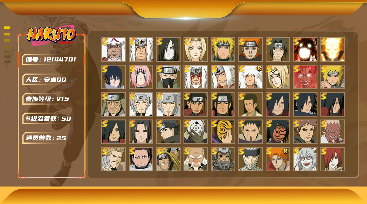 [12144701]V15 50S忍 87A忍 25通灵 2227W战力 可二次 可修改实名 优质装备:熊猫,千手柱间「秽土转生」,罗砂「四代目风影」,宇智波鼬「秽土转生」,佩恩·天道「超」,药师兜「仙人模式」,宇智波斑「秽土转生」,艾「三代目雷影」,宇智波斑 「木叶创立」,半藏「秽土转生」,千手扉间「秽土转生」,纲手「百豪」,无「二代目土影」,波风水门「秽土转生」,金角/银角「秽土转生」,猿飞日斩「秽土转生」,长门「秽土转生」,宇智波斑,千手柱间,千手扉间,神秘面具男,鬼灯幻月「二代目水影」,大野木「三代目土影」,迈特凯「死门」,宇智波带土 「忍界大战」,“宇智波斑” 「白面具」,漩涡鸣人 「九喇嘛连结」,大筒木金式「博人传」,春野樱 「忍界大战」,神秘面具男 「红夜之刃」,宇智波佐助「永恒万花筒」,千手柱间·木叶创立,宇智波斑「秽土转生·解」,大筒木桃式,艾「忍界大战」,宇智波止水「须佐能乎」,旗木卡卡西「须佐能乎」,大筒木舍人 「最终章」,自来也 「传说中的三忍」,漩涡鸣人 「暴怒·第六尾」,烈斗「初代目风影」 S级忍者:大野木 「忍界大战」,自来也 「舞之豪杰」,自来也「仙人模式」,宇智波鼬 「须佐能乎」,佩恩「天道」,猿飞日斩,波风水门,大蛇丸,自来也,纲手
