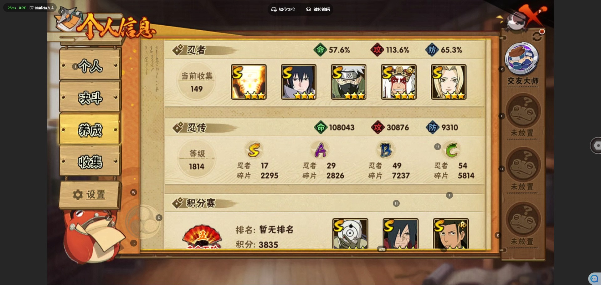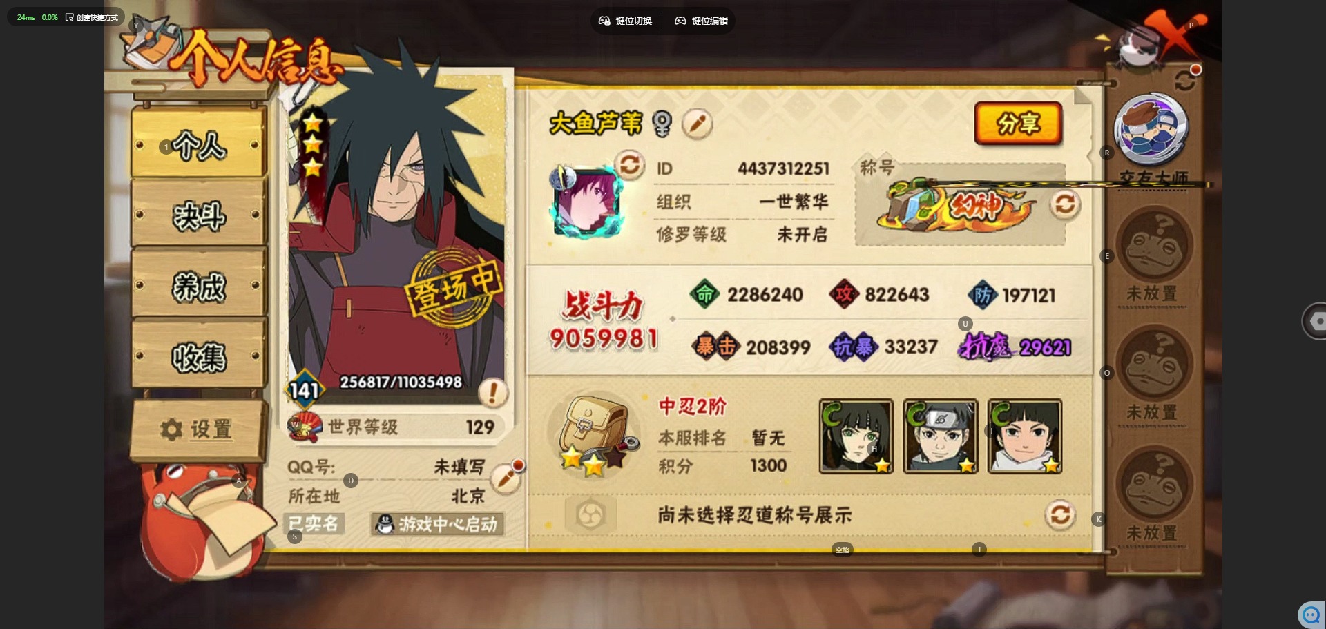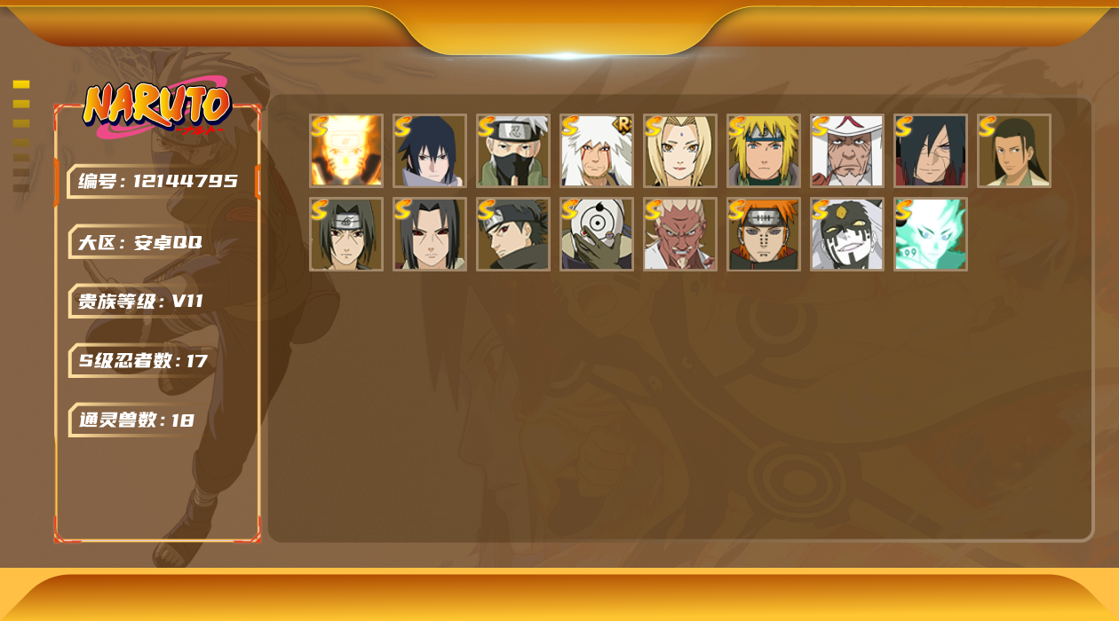 [12144795]V11 17S忍 29A忍 18通灵 905.9W战力 可二次 可修改实名 优质装备:宇智波鼬「秽土转生」,“宇智波斑” 「白面具」,漩涡鸣人 「九喇嘛连结」,宇智波佐助「永恒万花筒」,千手柱间·木叶创立,宇智波斑「秽土转生·解」,大筒木桃式,艾「忍界大战」,宇智波止水「须佐能乎」,旗木卡卡西「须佐能乎」,大筒木舍人 「最终章」 S级忍者:自来也 「舞之豪杰」,宇智波鼬 「须佐能乎」,佩恩「天道」,猿飞日斩,波风水门,纲手