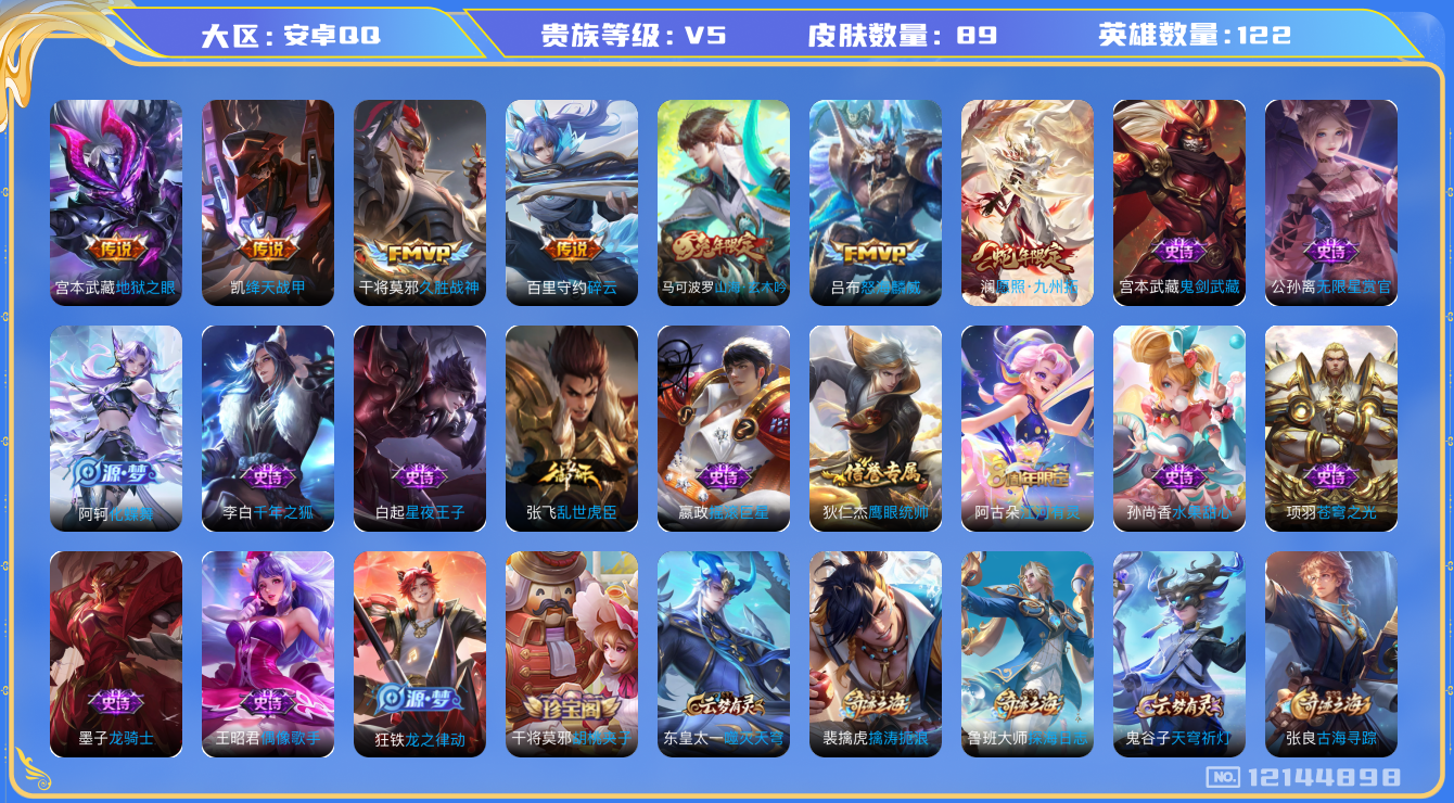 - [11883738]V7 1无双 20传说 125英雄 281皮肤 可修改实名 优质装备:器灵·螭龙剑,黄金狮子座,黄金射手座,云鹰飞将(小将军),绛天战甲(鸡嘴战神),久胜战神,炽阳神光,一念神魔,零号·赤焰,地狱之眼,时之恋人-刘备(电焊工),游龙清影(小青龙),超时空战士-狄仁杰,惊梅引,澜逐花归海 传说皮:落雪白狼,祥瑞亨通,幻光神枪 珍宝阁皮:万物之道,蔷薇恋人,女武神 限定皮:鸣野蒿,武陵仙君(小桃花),傲雪梅枪,神威(电光马子),遇见飞天,高山流水,五谷丰年,游园惊梦,梁祝,祈雪灵祝(雪兔子),天狼绘梦者,李小龙,霸王别姬-项羽,山海·玄木吟(马可年限) 史诗皮:器灵·浮梦炉,星界战将,破空之剑,琥珀纪元伽罗,百相守梦-百里守约,百相守梦-黄忠,遇见神鹿,紫霞仙子,黄金分割率,特工魅影,永昼,江河有灵,雪夜绮愿(周瑜),魅语,百解令(蒙犽),蒙恬荣光圣徽,无限星赏官,冰冠公主,晚萤,电玩·爆裂旋风,暗夜猫娘,末日机甲-吕布,猫狗日记-孙策,乱世虎臣,节奏热浪,修罗,女仆咖啡,摇滚巨星,水果甜心,绅士熊喵,天才门将,星夜王子,德古拉伯爵,幽灵船长,鬼剑武藏,暗渊魔法,舞动绿茵,地狱岩魂,纤云弄巧,拒霜思,缤纷独角兽,月团寄思,水晶猎龙者,曙光守护者,金属风暴,原初追逐者,圣诞狂欢,圣诞恋歌,鹰眼统帅,暗夜贵公子,魅力维加斯,黎明之约,无心