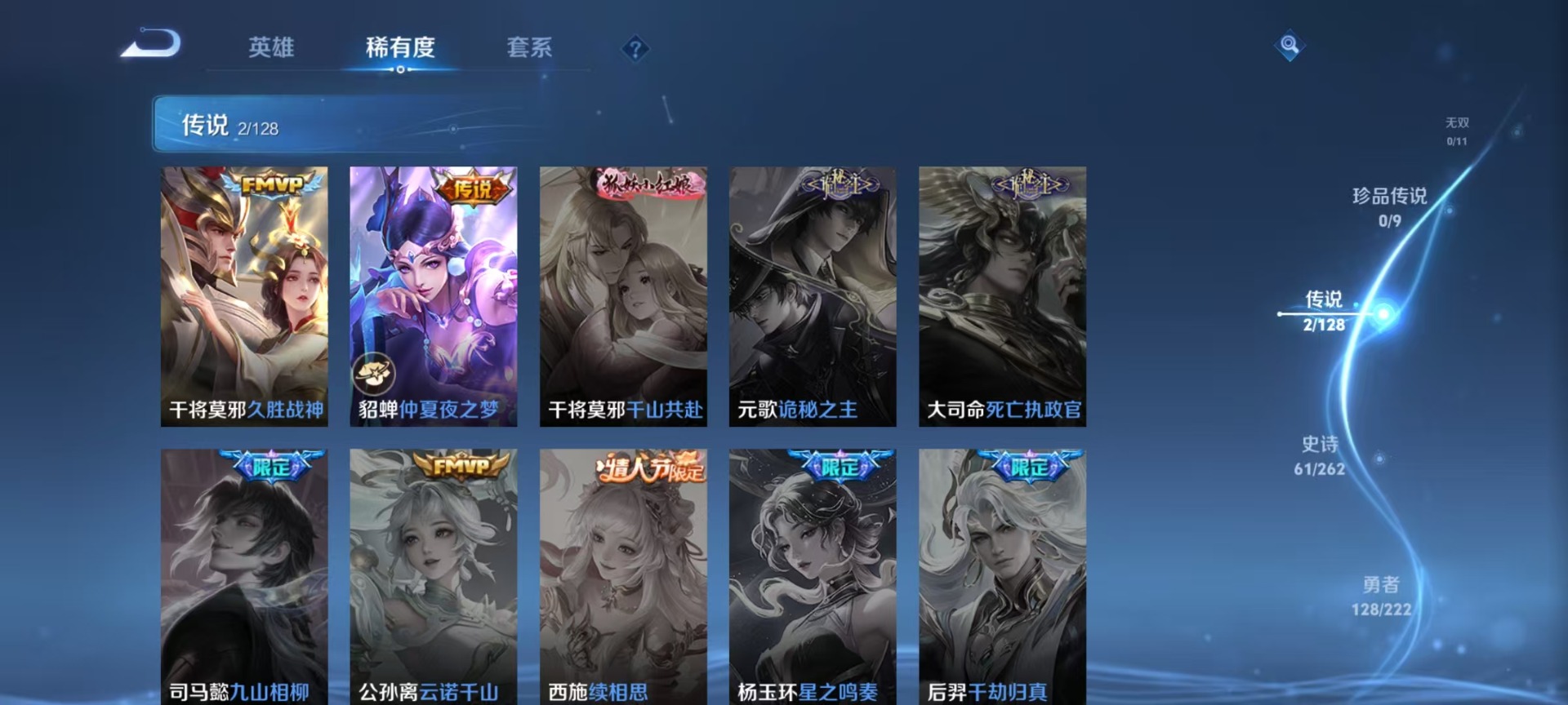 夏侯惇朔风刀,沈梦溪大漠名商,达摩沙漠行僧,项羽苍威无极,镜青焰无极,元歌云间偶戏,兰陵王金庭之子,裴擒虎擒涛扼浪,鲁班大师探海日志,鬼谷子原初探秘者,张良古海寻踪,桑启海盐诗旅,狄仁杰万华元夜,程咬金演武夺筹,李元芳云中旅人,钟馗驱傩正仪