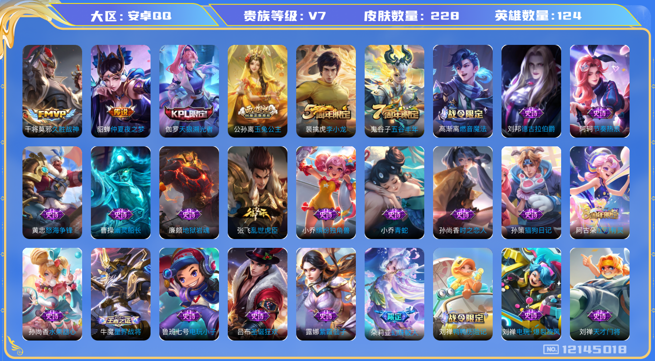 [12145018]V7 2传说 124英雄 228皮肤 可修改实名 优质装备:久胜战神,仲夏夜之梦(大飞蛾) 珍宝阁皮:胡桃夹子,玩趣恶龙 限定皮:五谷丰年,天狼溯光者,李小龙,玉兔公主 史诗皮:鸭鸭历险记-刘禅,龙之律动,星界战将,蒙犽顽岩魄,芈月浮光幕影,怒海争锋,幻珠鲛人,紫霞仙子,电玩小子(小书包),特工魅影,江河有灵,青蛇,高渐离燃音魔法,蒙恬荣光圣徽,电玩·爆裂旋风,无限星赏官,晚萤,猫狗日记-孙策,时之恋人-孙尚香,乱世虎臣,节奏热浪,女仆咖啡,摇滚巨星,水果甜心,绅士熊喵,天才门将,星夜王子,心灵骇客,功夫厨神,德古拉伯爵,暗隐猎兽者,幽灵船长,鬼剑武藏,心灵战警,乐园奇幻夜,天秀·启明,地狱岩魂,纤云弄巧,缤纷独角兽,逐浪之夏,水晶猎龙者,热力回旋,金属风暴,圣诞狂欢,圣诞恋歌,鹰眼统帅,黎明之约,未来纪元-赵云